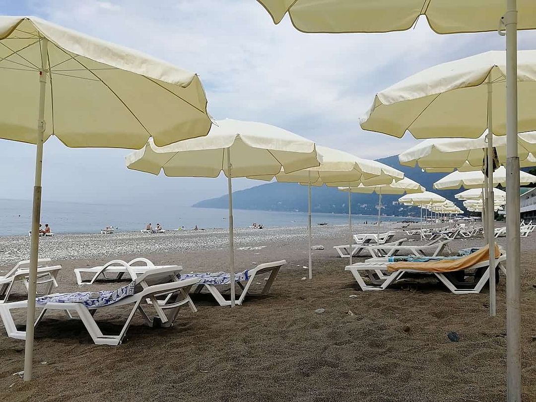 На пляже есть шезлонги и зонты, места хватает всем. Пляж грязный , ветки, щепки, никто похоже не убирает. На пляже Галька, лучше брать соответствующую обувь.