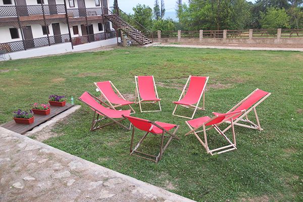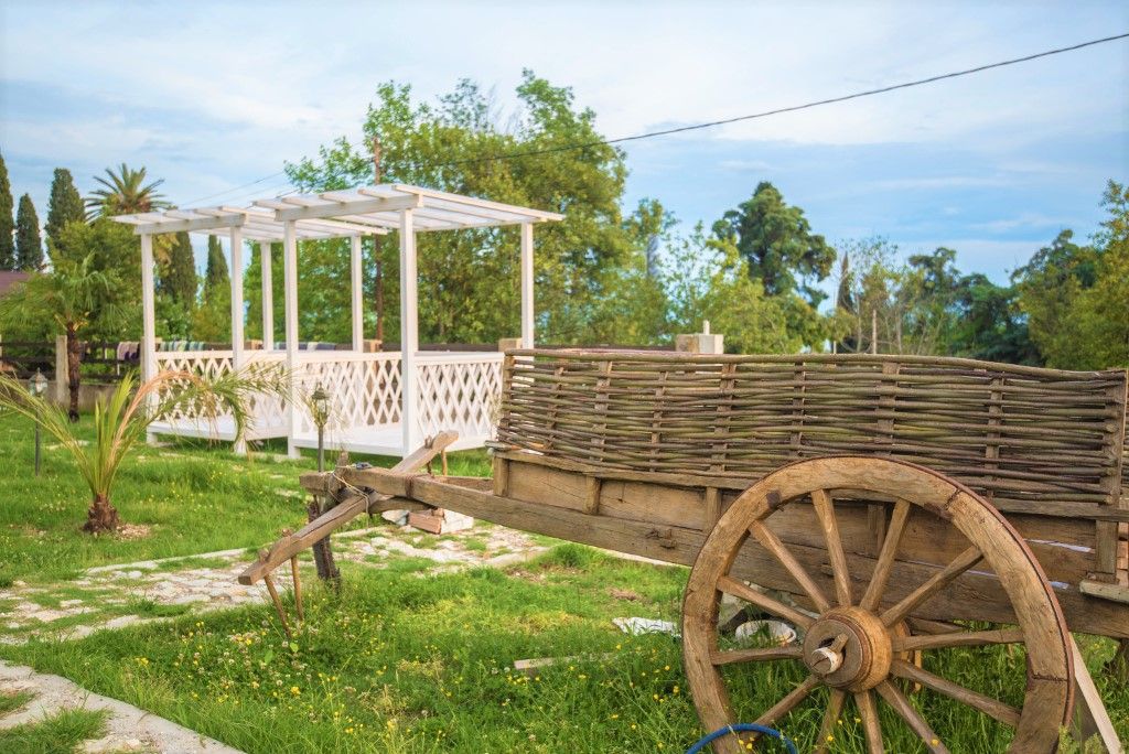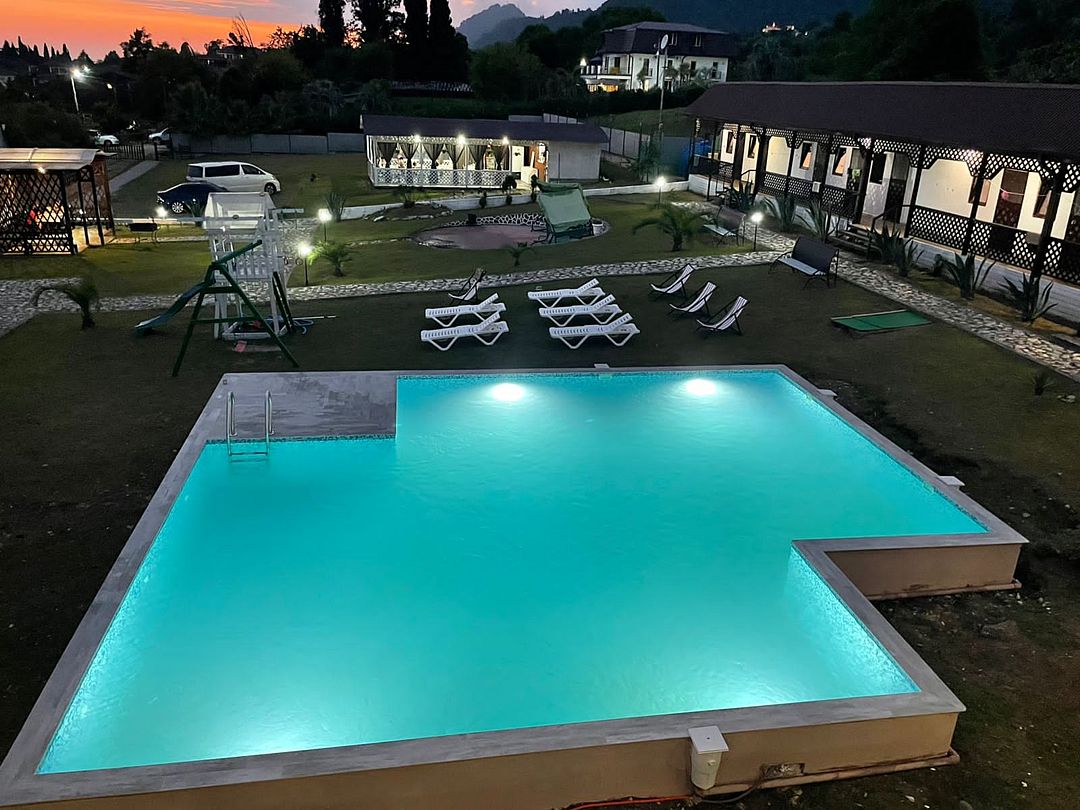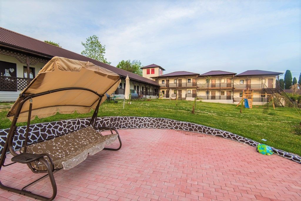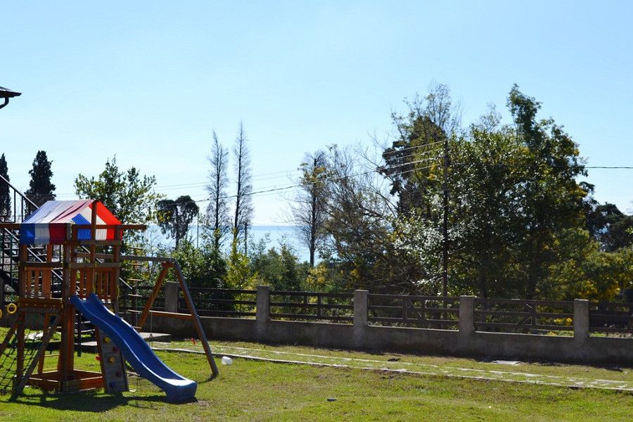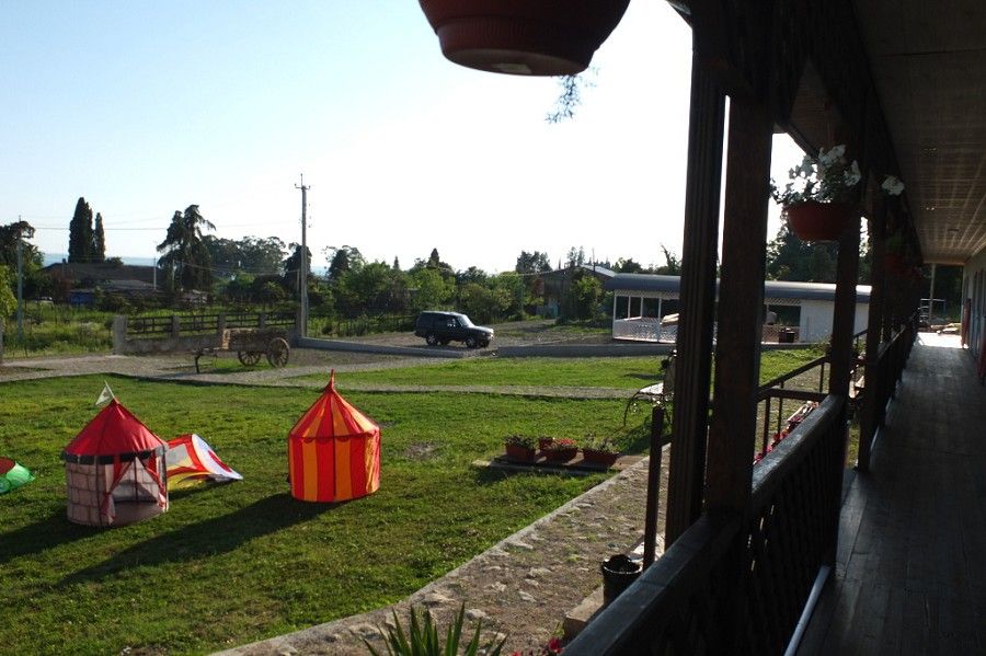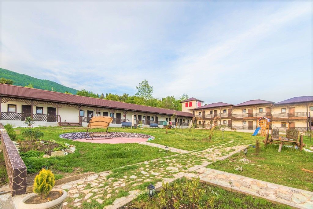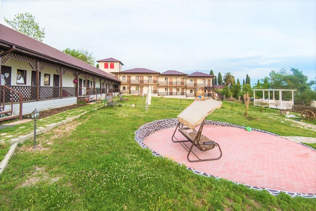 Пансионат окружает плетень и привлекательная зеленая территория в стиле аутентичного абхазского подворья. На собственной закрытой территории – настоящий деревенский колорит, поскольку это натуральная сельская местность, питомник в селе Псырцха. При этом на территории есть WI-FI и другие блага цивилизации.