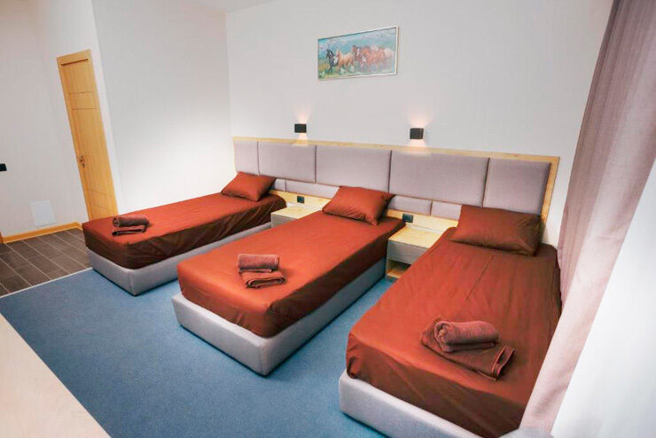 Каждая комната имеет все необходимые условия для комфортного проживания и хорошего отдыха. Номера оснащены отоплением и звукоизоляцией, есть телевизор. Наличие балкона - приятный бонус для гостей. Из некоторых комнат открывается прекрасный вид на горный пейзаж.