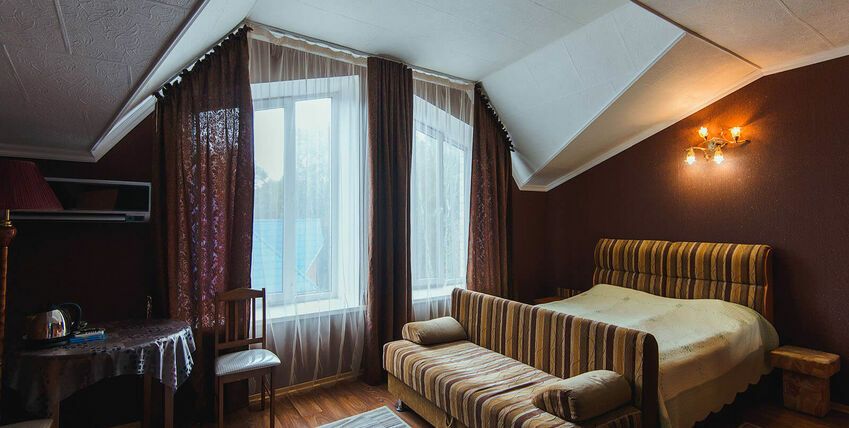 Одна комната, односпальные и двухспальная кровати, мягкая мебель , журнальный столик, Wi-Fi, спутниковое телевидение, чайный сервиз, электрический чайник, холодильник, душевая кабина, сан.узел.