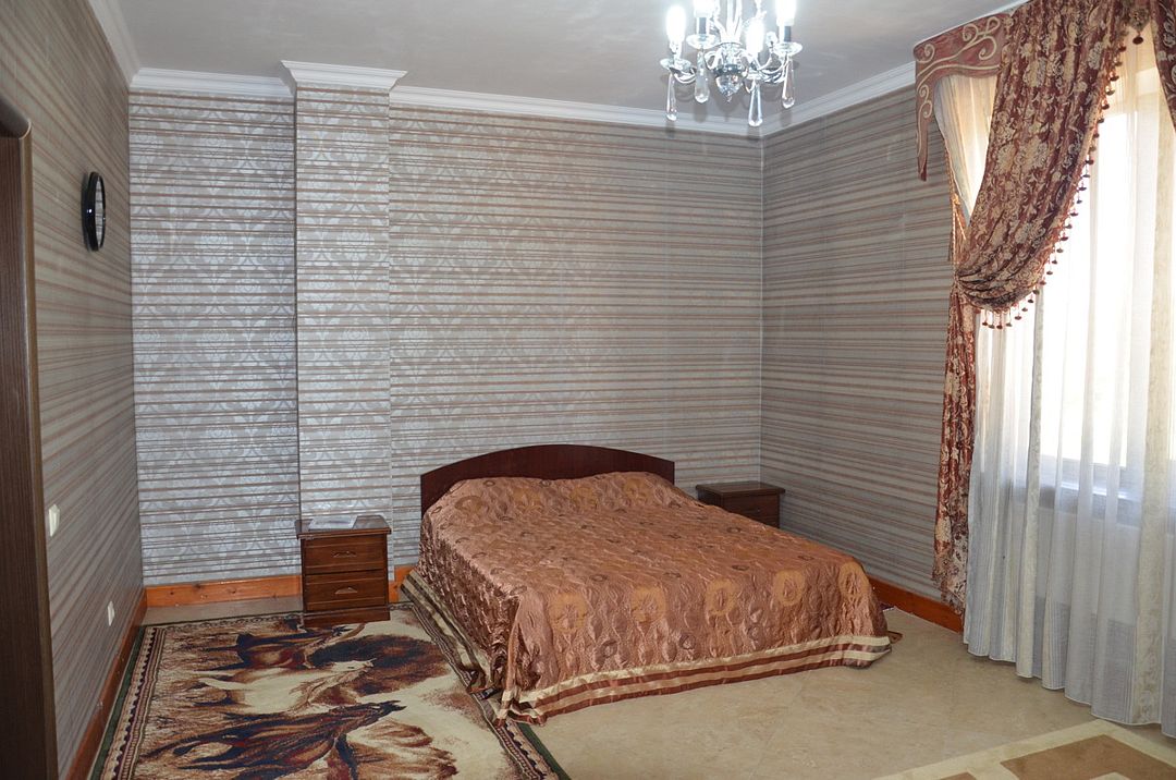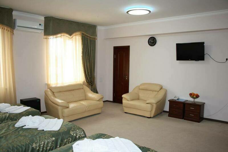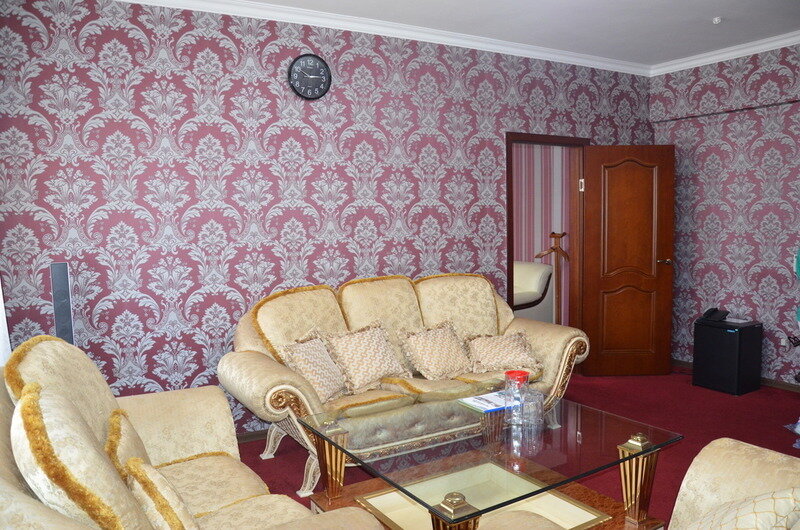 Номер состоит из 3-х комнат расчитан на 4 персоны. В номере 1 двухспальная кровать и 2 односпальные, прикроватные тумбы, шкаф, трюмо, мягкая мебель, телевизор со спутниковым телевидением, 2 кондиционера, холодильник (мини бар), сейф, встроенный фен, халаты, набор полотенец, одноразовые средства личной гигиены.
