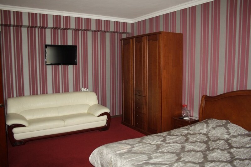 Номер рассчитан на одну или две персоны. Номер состоит из 2-х комнат: спальня и гостиная. В номере: двухспальная кровать, прикроватные тумбы, шкаф, трюмо, мягкая мебель, плазменный телевизор, кондиционер, холодильник (мини бар), сейф, встроенный фен, халаты, набор полотенец, одноразовые средства личной гигиены