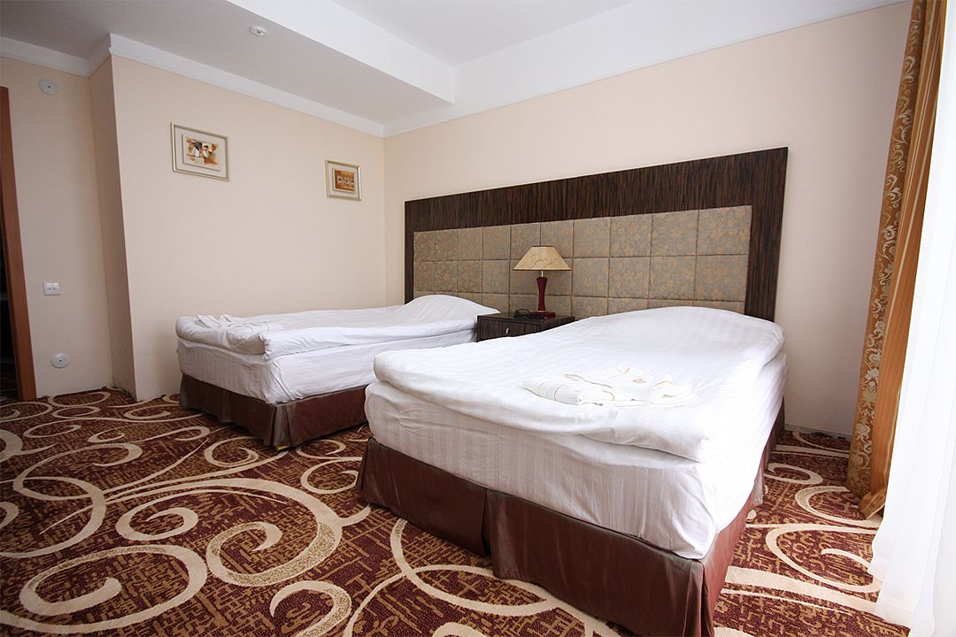 раздельные кровати, прикроватные тумбочки, журнальный стол, шкаф, ТВ, санузел и душ, Wi Fi, мыло, шампунь.