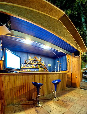 На пляже теневые зонты, зонтики и лежаки, есть зона для пляжного волейбола. В прибрежной парковой зоне в тени деревьев расположены бар с кальяном, летнее кафе с национальной кухней и топчаны.