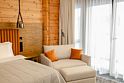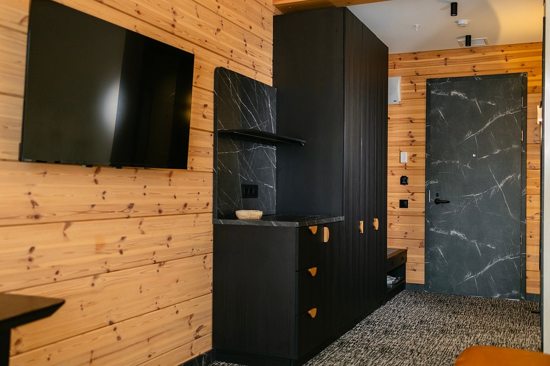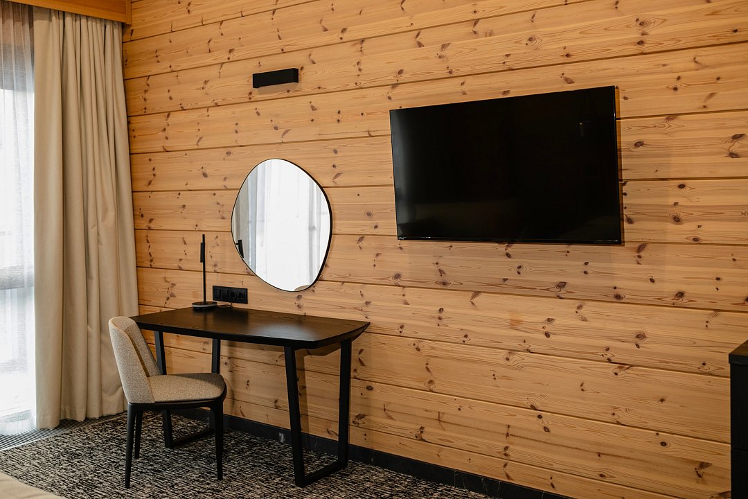 В шале гармонично сочетаются природные материалы, лаконичный интерьер и функциональность. Отдельная спальня обеспечивает полноценный сон и восстановление, а общая зона располагает к спокойному отдыху после процедур и прогулок на свежем воздухе.
