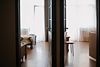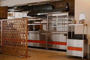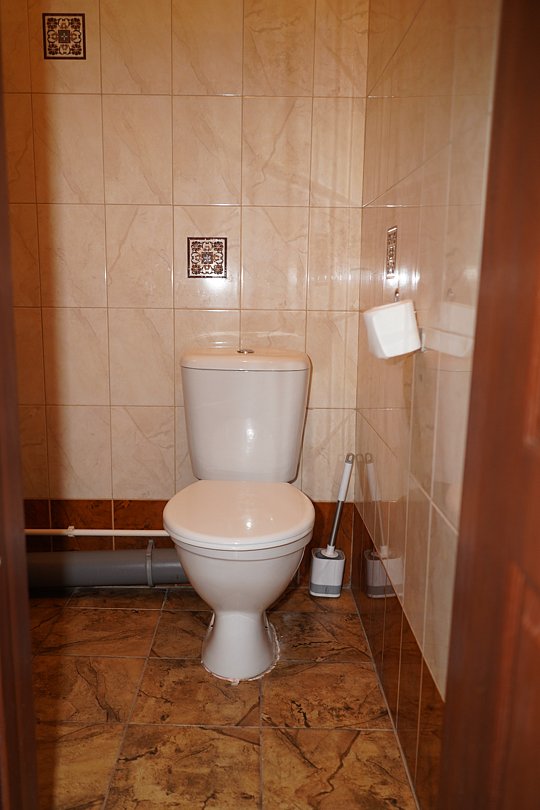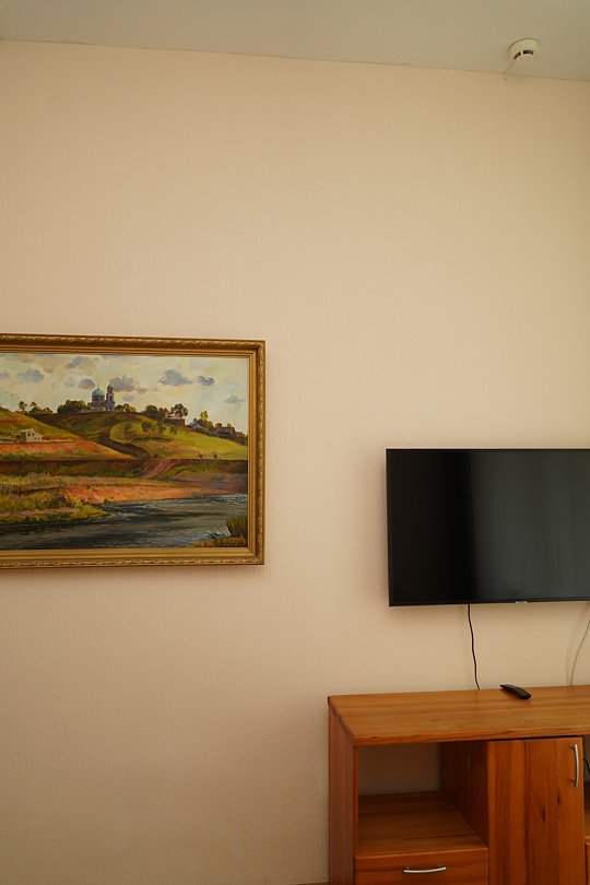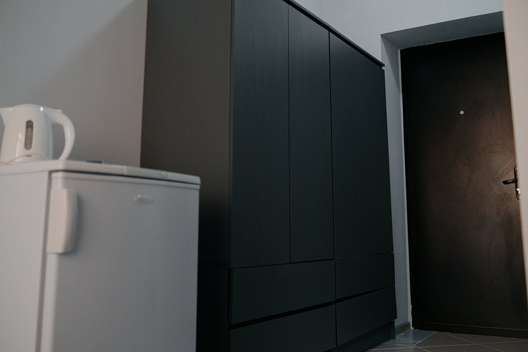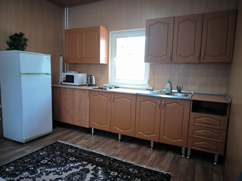 Номера находятся в цокольном этаже с общей укомплектованной кухней. В кухне плита, духовой шкаф, стол, стулья, два холодильника, термопот, электрический чайник, микроволновая печь.