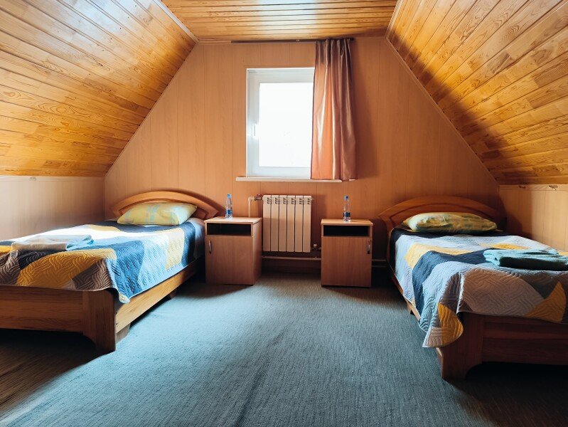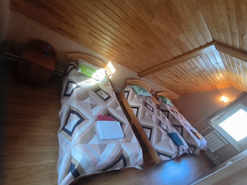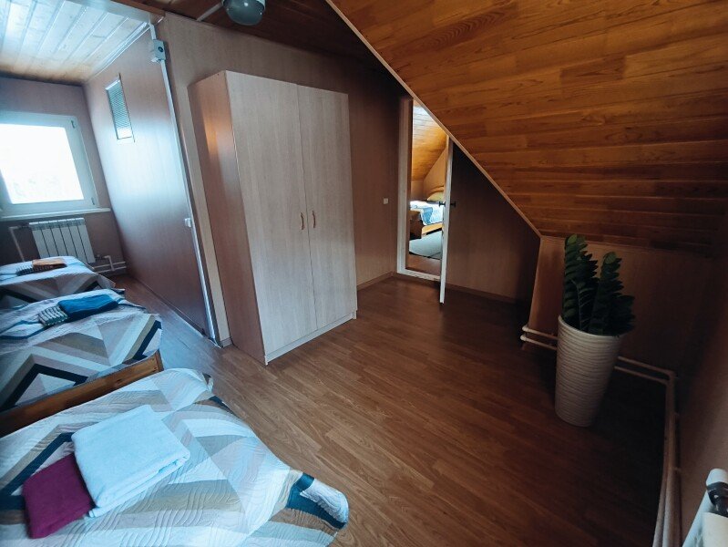 Второй этаж две спальни одна проходная с двумя односпальными кроватями и спальня с четырьмя односпальными кроватями, прикроватные тумбы. Санузел.