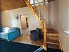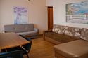 В спальнях по две односпальных кровати, телевизор, шкаф под вещи, мини холодильник, электрический чайник, журнальный столик.