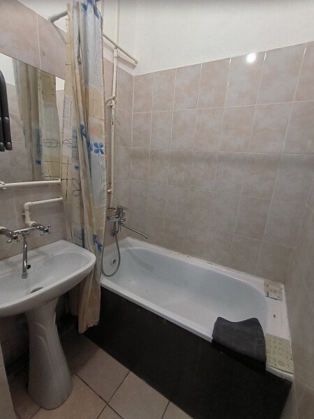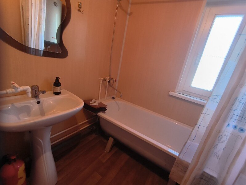 Гостиная с двумя раскладными диванами, кресло, телевизор. Санузел с ванной.