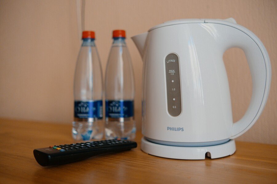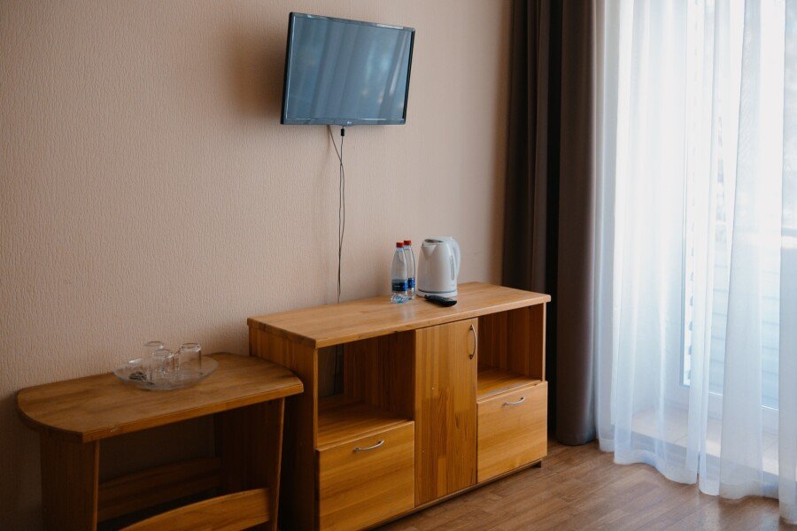 Двуспальная кровать, шкаф, телевизор, мини холодильник, электрический чайник.