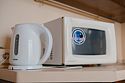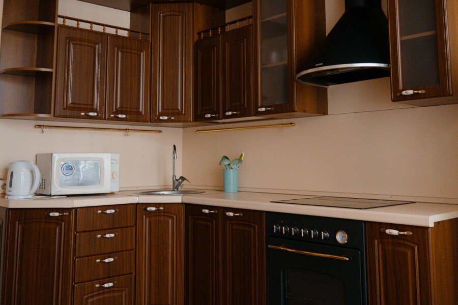 Укомплектованная кухня: плита, микроволновая печь, электрический чайник, духовой шкаф, холодильник.