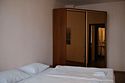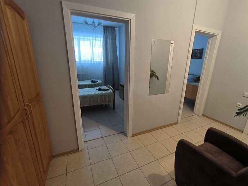 Во второй спальне две односпальные кровати, телевизор, шкаф под вещи, мини холодильник, электрический чайник, журнальный столик.