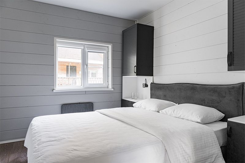 Одноэтажный деревянный коттедж категории 3 *** с современной мебелью и дизайнерским интерьером. Одна комната, ванная комната с душем. В комнате кровать 160*200 или