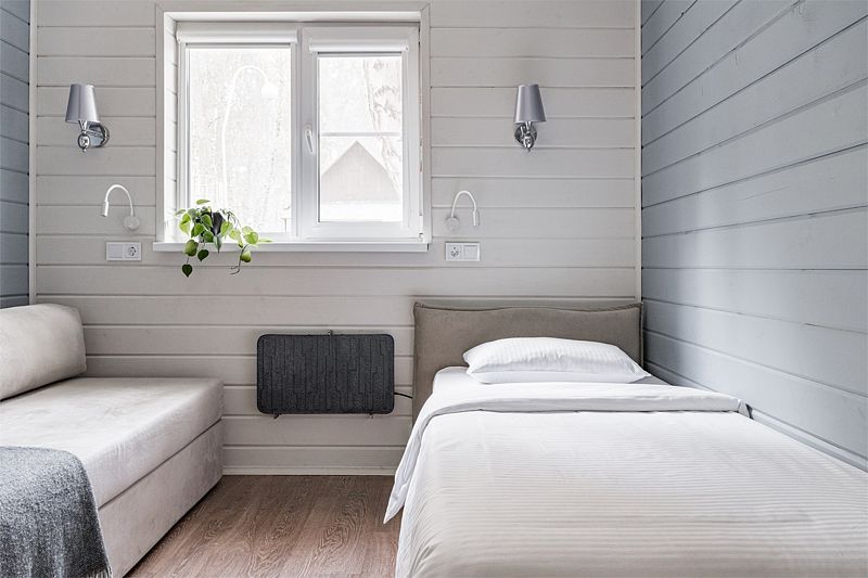 две односпальные кровати трансформера 90*200,которые при необходимости раздвигаются на два спальных места, что позволяет создать отдельные спальные места для детей, так же удобные места хранения для ваших вещей, если вы планируете длительный отдых. Комфортный сон Вам обеспечат ортопедические матрасы и шторы блэкаут со 100% затемнением. Коттедж предназначен для отдыха семьи из двух гостей, (при бронировании одной половины) и 4 человек при бронировании коттеджа полностью.