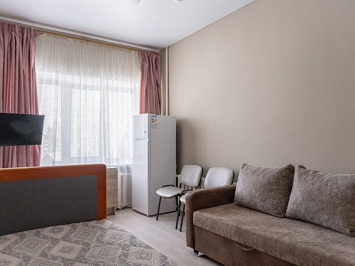 Номер соответствует I категории классификации номеров, имеет площадь 12м2, оснащен необходимой для комфортного проживания мебелью и техникой: шкаф для одежды, диван-кровать, одна односпальная кровать размером 90*200, телевизор, холодильник, стол, стулья, постельные принадлежности, полотенце на каждого гостя предоставляются бесплатно. Собственная ванная комната. По запросу гостей предоставляется чайник, необходимая посуда. Ежедневная уборка номера. Смена постельного белья 1 раз в 3 дня, либо по просьбе гостя. Максимальное количество гостей 2