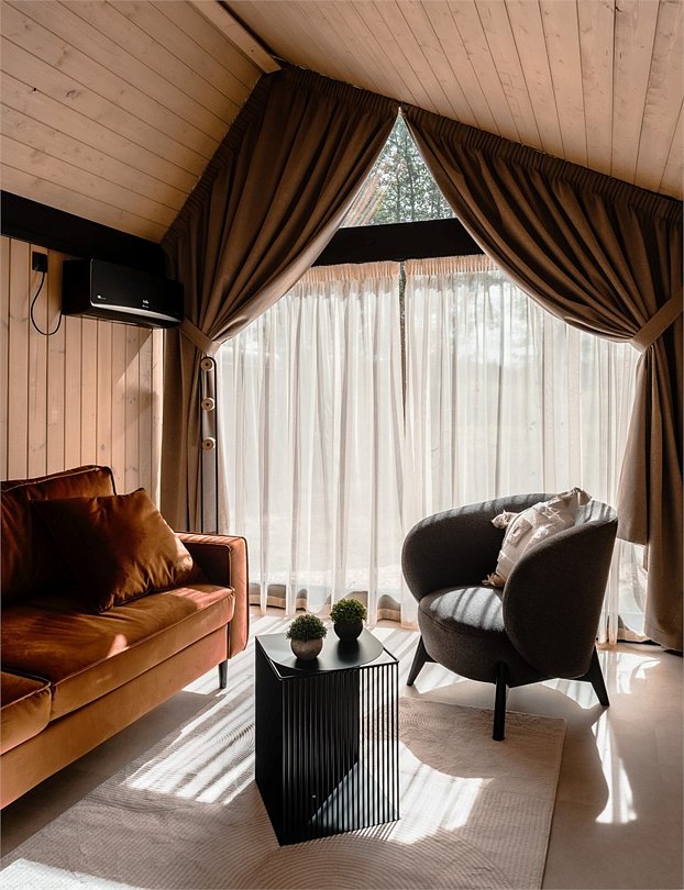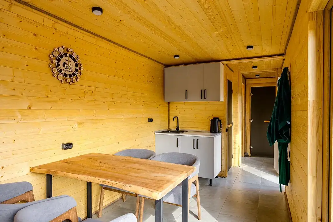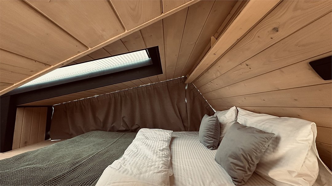 Домик рассчитан на 2 человек, предлагая комфортное пространство для наших гостей. Уютный интерьер с натуральными деревянными панелями создают теплую и гостеприимную атмосферу.