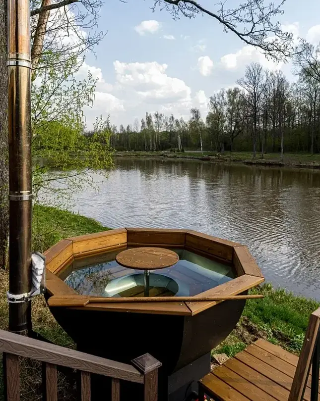 Уютный дом у озера в «Бухлово Парк» площадью 30 кв.м. с персональным чаном — идеальное место для романтического уединения или спокойного отдыха на природе.