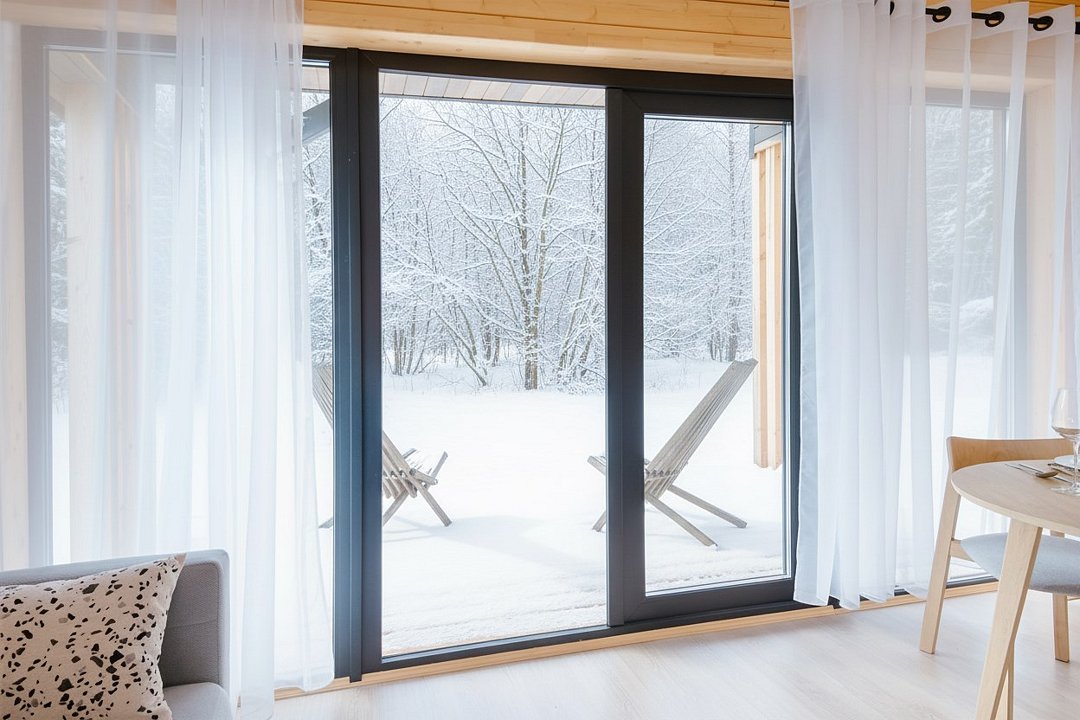 Его панорамные окна и высокие потолки придают ему стильный и современный вид. Перед домиком расположена небольшая деревянная терраса со стульями и барбекю, что идеально подходит для отдыха на свежем воздухе.