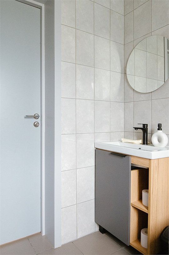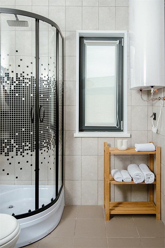Освежитесь в стильной ванной комнате с душевой кабиной и всеми необходимыми туалетными принадлежностями.