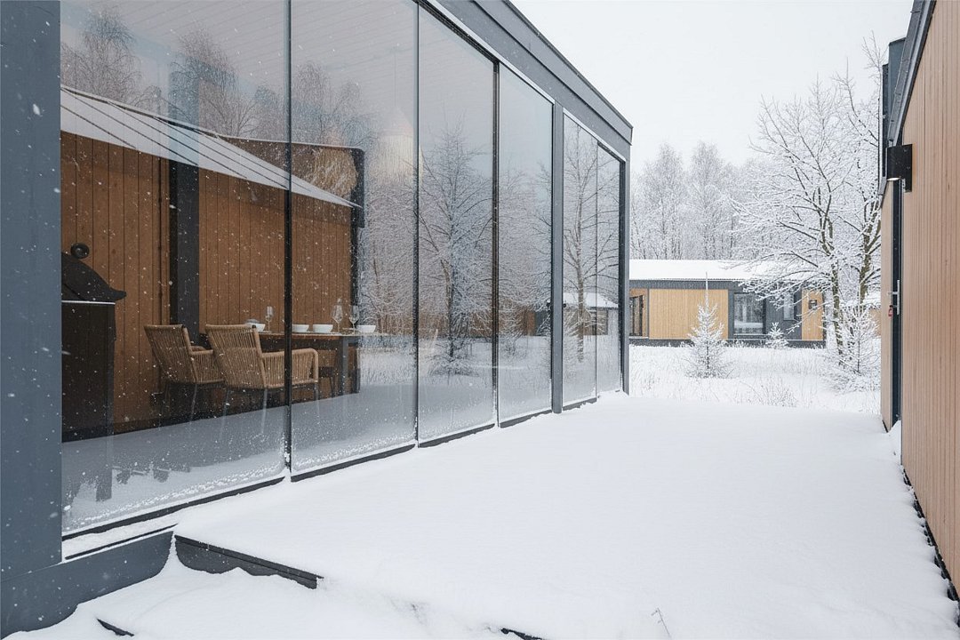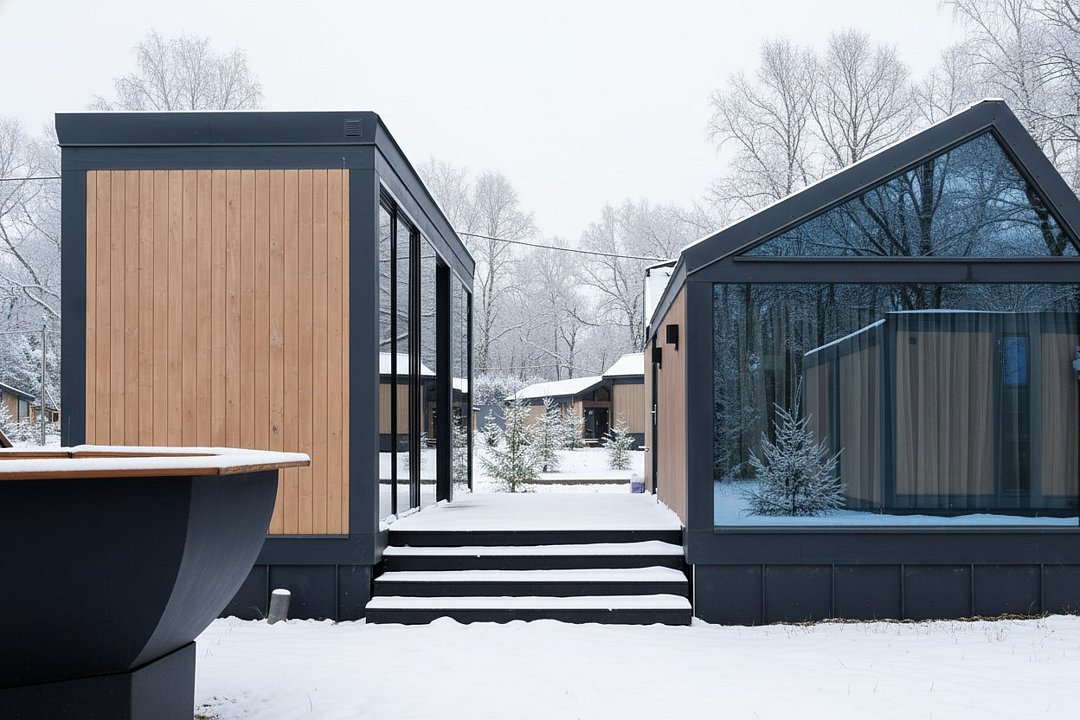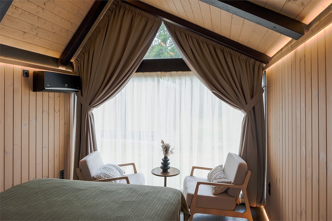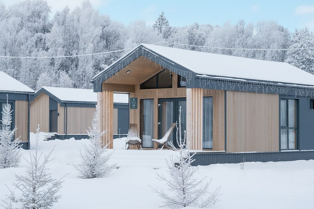 Современный и компактный домик, который идеально подходит для уютного отдыха. Его панорамные окна и высокие потолки придают ему стильный и современный вид.