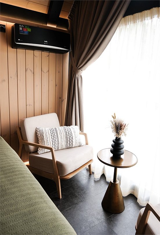 Особое удовольствие — большая терраса с мебелью, газовым грилем и собственной горячей купелью под открытым небом. Это место, где вечера становятся длиннее, разговоры — тише, а отдых — глубже.