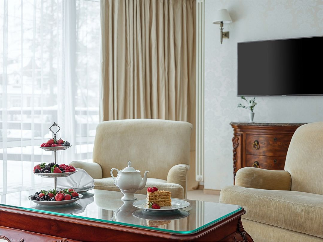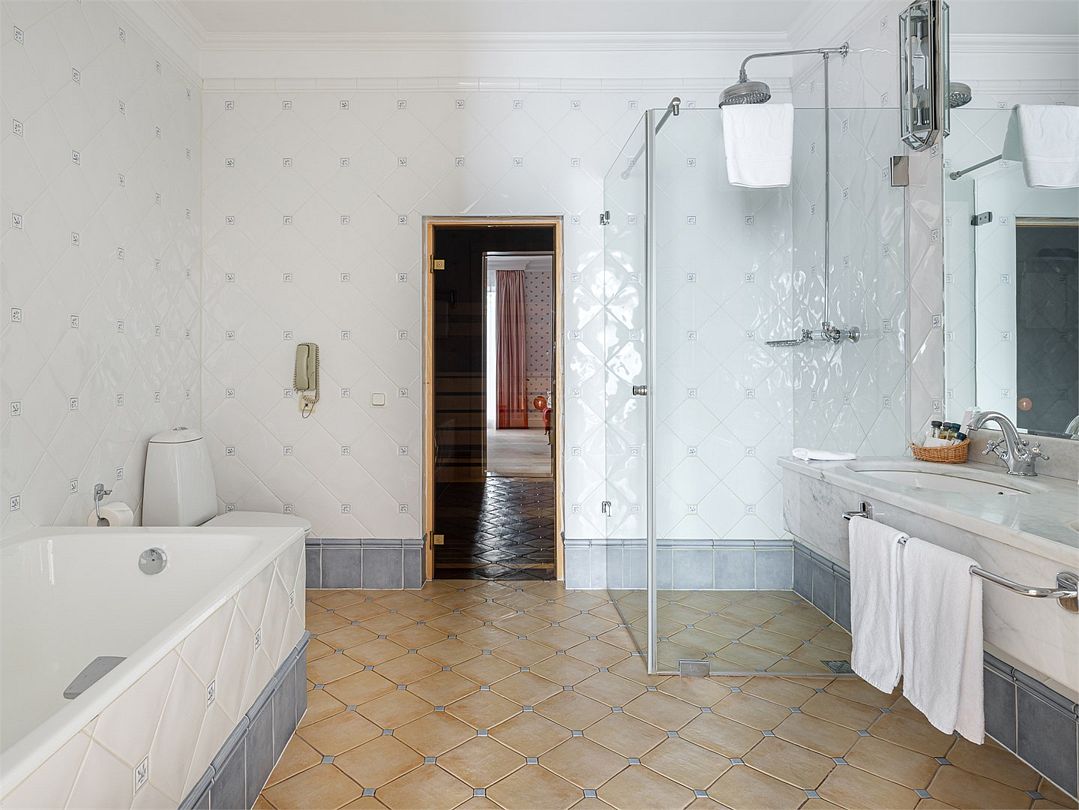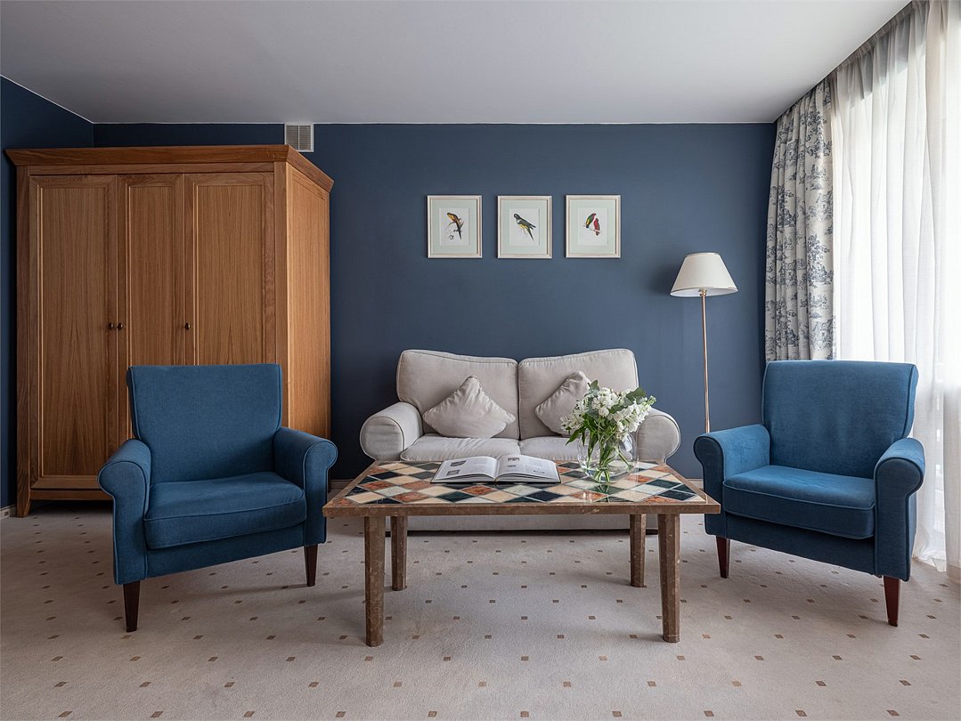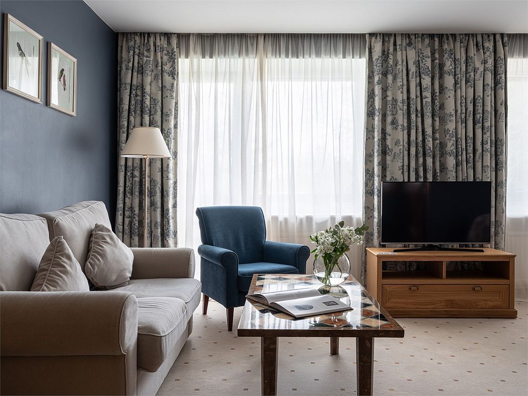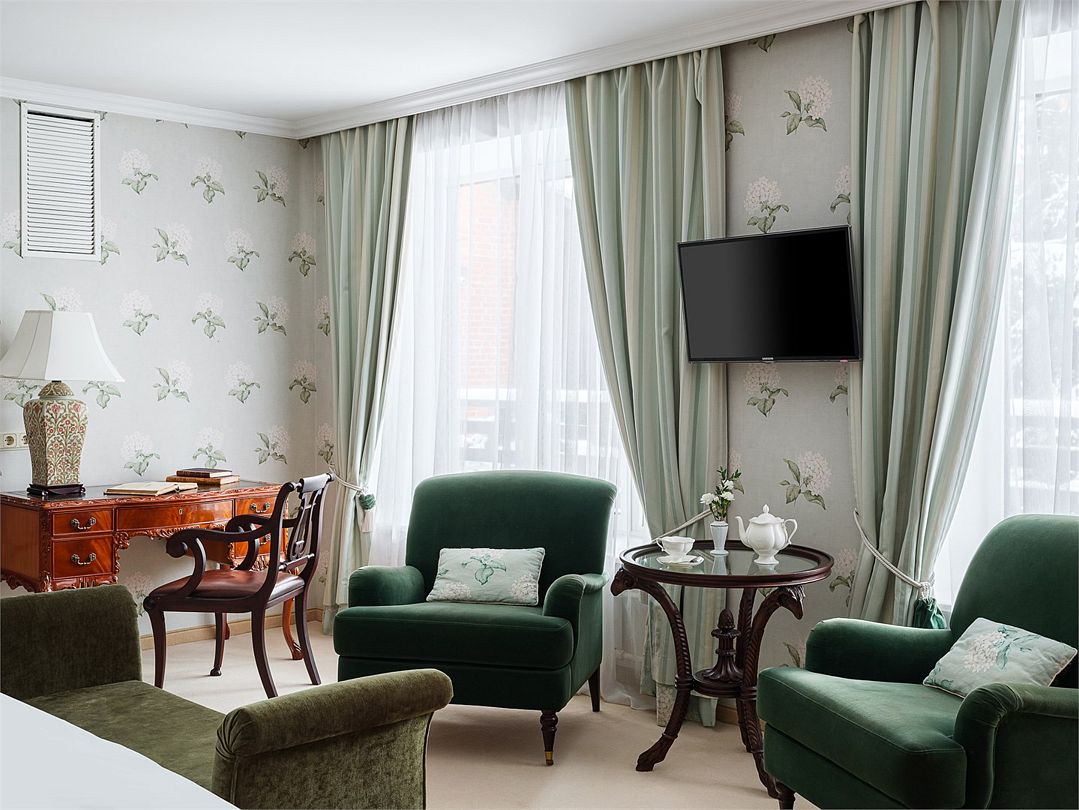 Просторный трехкомнатный номер, площадью 110 кв.м., оформленный в классическом стиле в золотых и зеленых тонах, прекрасно подойдёт для отдыха большой семье или двум парам. Уникальный по расположению и планировке, он совмещает в себе две полноценные спальни с персональными ванными комнатами, полностью отделанными мрамором, просторную гостиную, а также шикарную террасу с видом на бассейн и Финский залив.