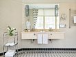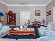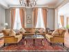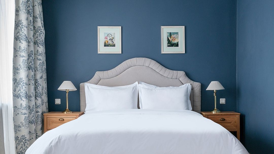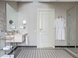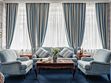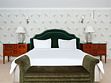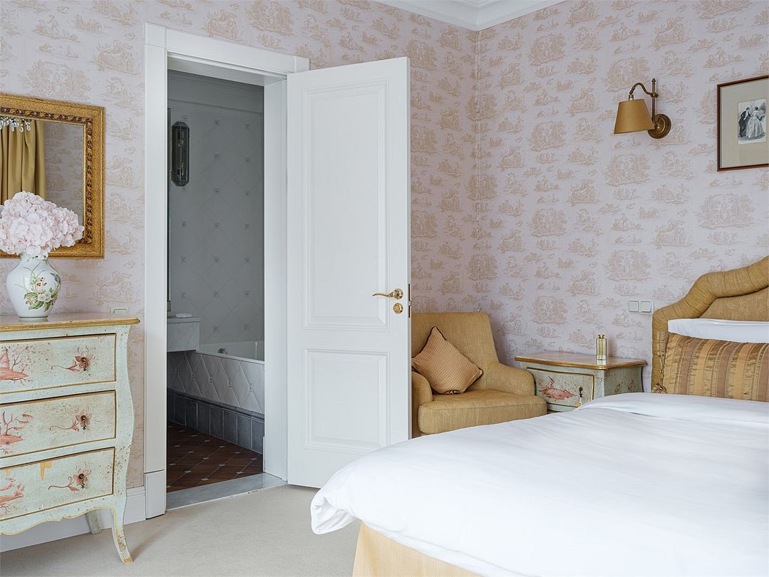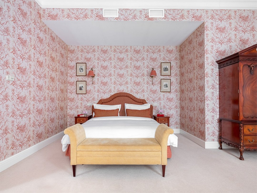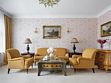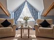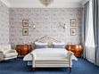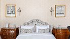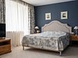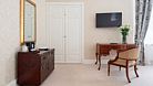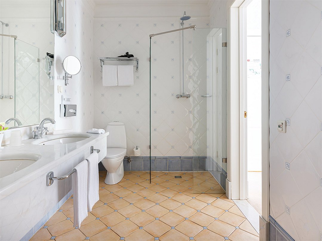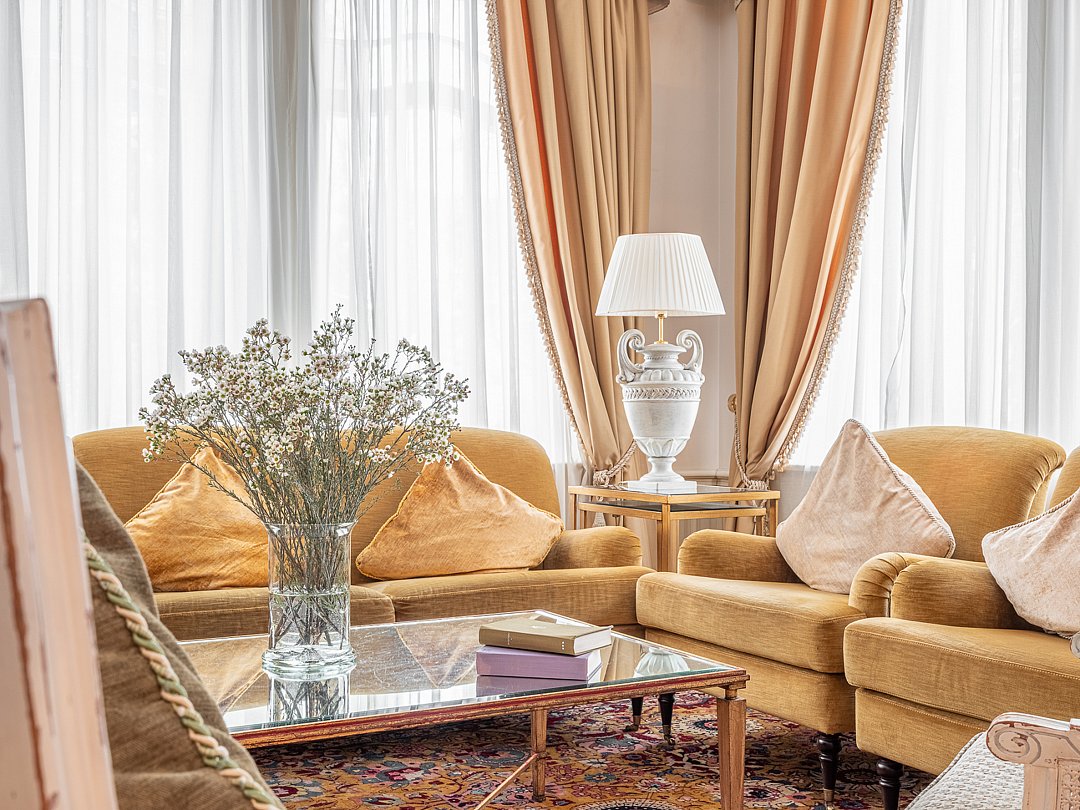 Просторный трехкомнатный номер, площадью 110 кв.м., оформленный в классическом стиле в золотых и зеленых тонах, прекрасно подойдёт для отдыха большой семье или двум парам. Уникальный по расположению и планировке, он совмещает в себе две полноценные спальни с персональными ванными комнатами, полностью отделанными мрамором, просторную гостиную, а также шикарную террасу с видом на бассейн и Финский залив.