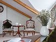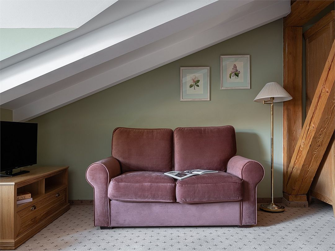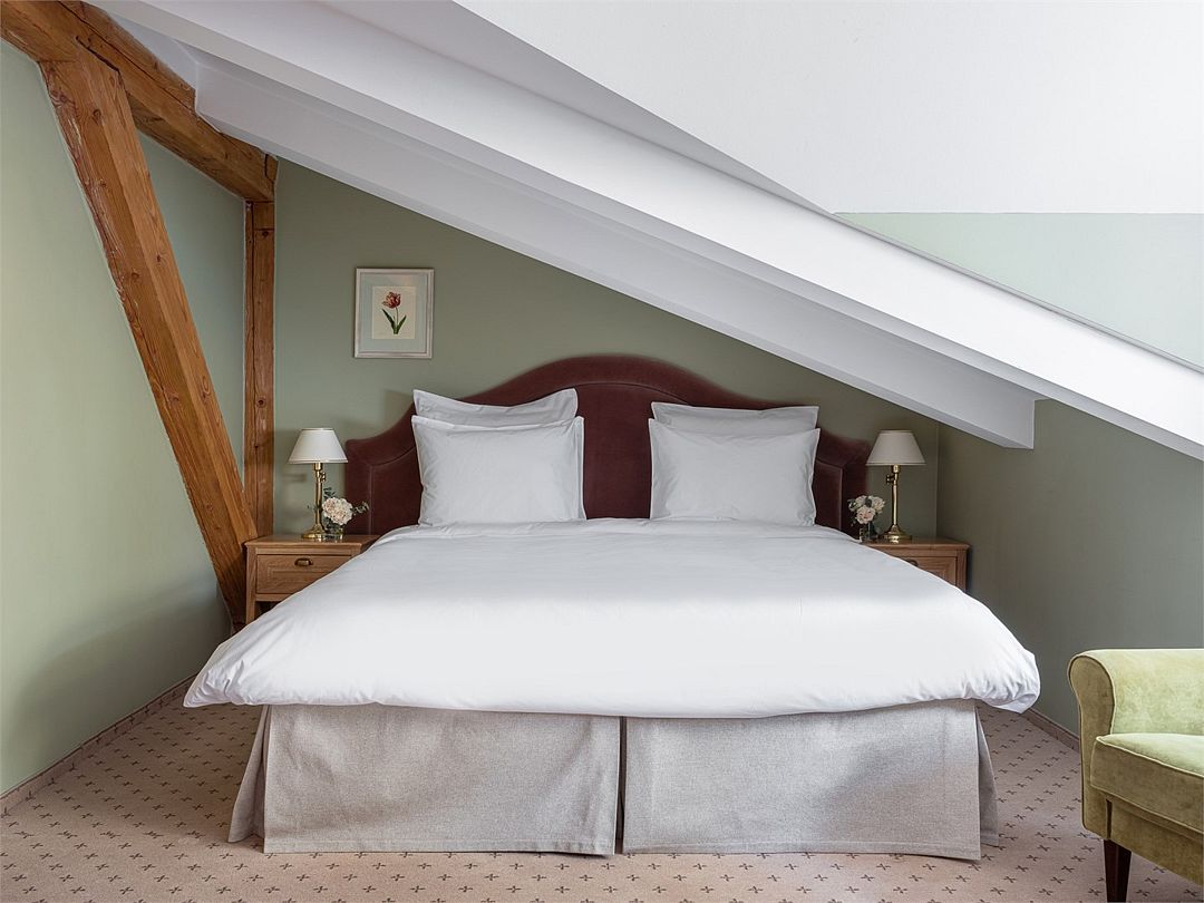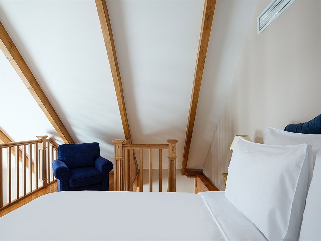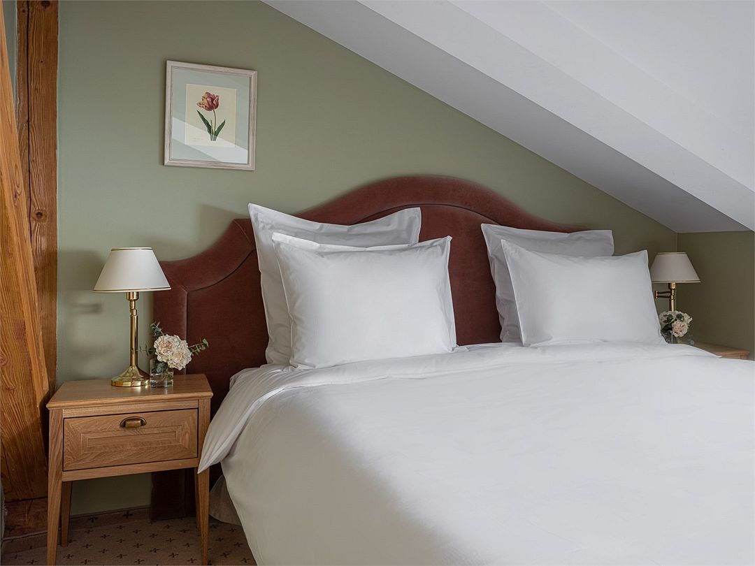 Уютный однокомнатный номер с общей площадью 20 кв. м., расположен под крышей на третьем этаже главного здания отеля. Из номера открывается вид на бассейн или на тихую улицу.