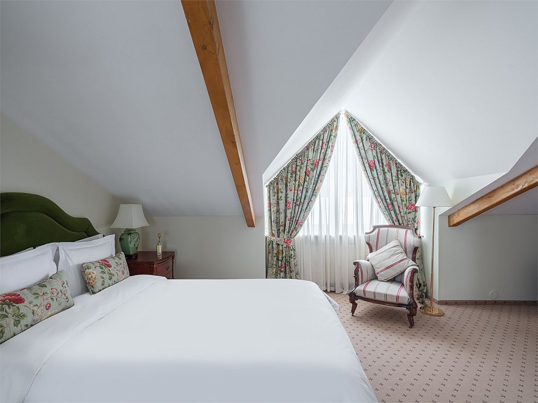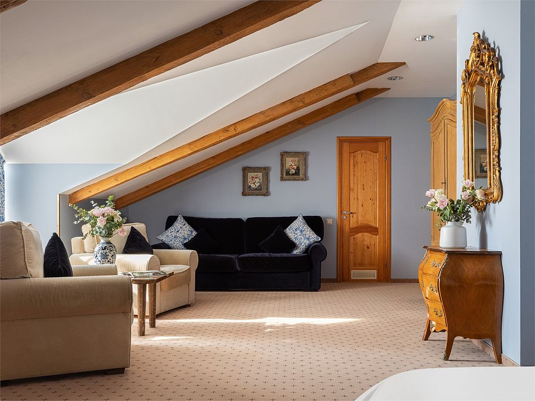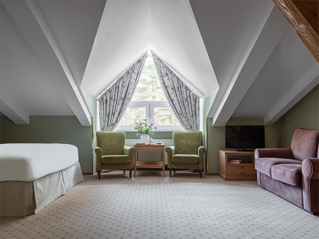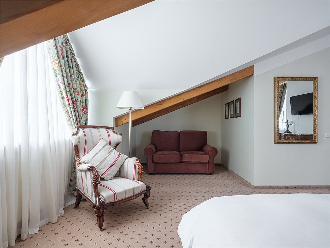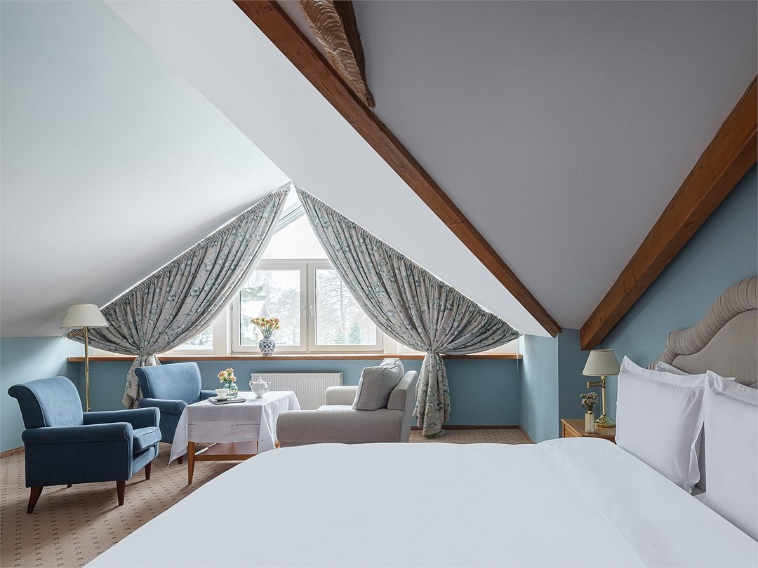 Просторный номер мансардного плана находится на 3м этаже основного корпуса Загородного клуба «Скандинавия» и СПА, общая площадь 60 кв. м., с изысканным интерьером в классическом стиле и элементами антиквариата, в дизайне интерьера преобладают бежево-зеленые тона. Гостиная и спальня разделены перегородкой, два TV, сейф, мини-бар. В гостиной находится два мягких кресла, двухместный диван, журнальный столик, шкаф-гардероб, кофейный столик со стульями. Спальня оборудована большой двухспальной кроватью, раскладным диваном, прикроватными тумбами, настольными лампами, торшером, у окна находится будуарное кресло. Вид из гостиной на дачу Лихачёва и бассейн, из спальни — на бизнес-центр. Ресторанное обслуживание в номере 24 часа.