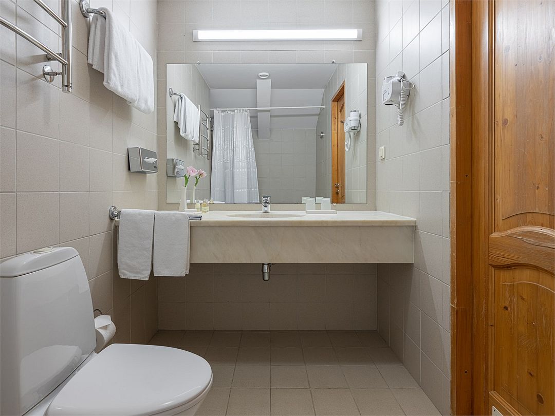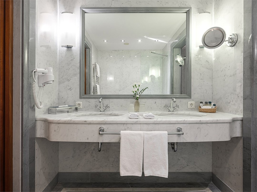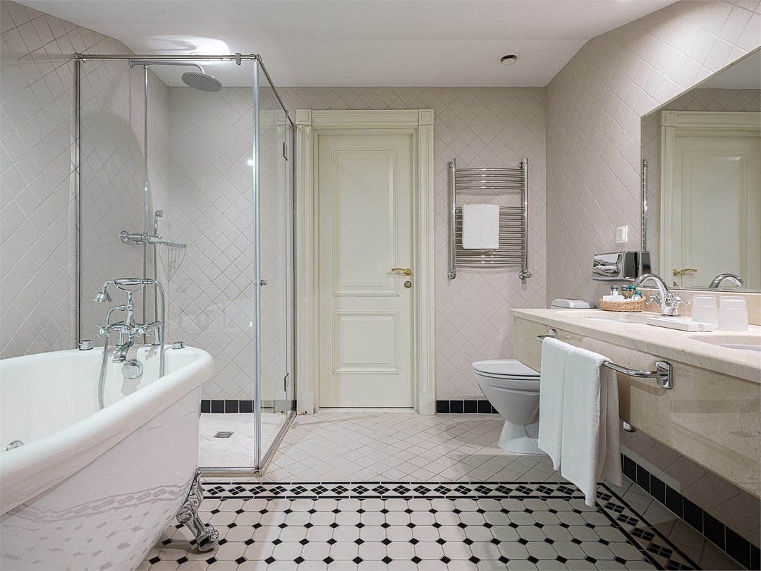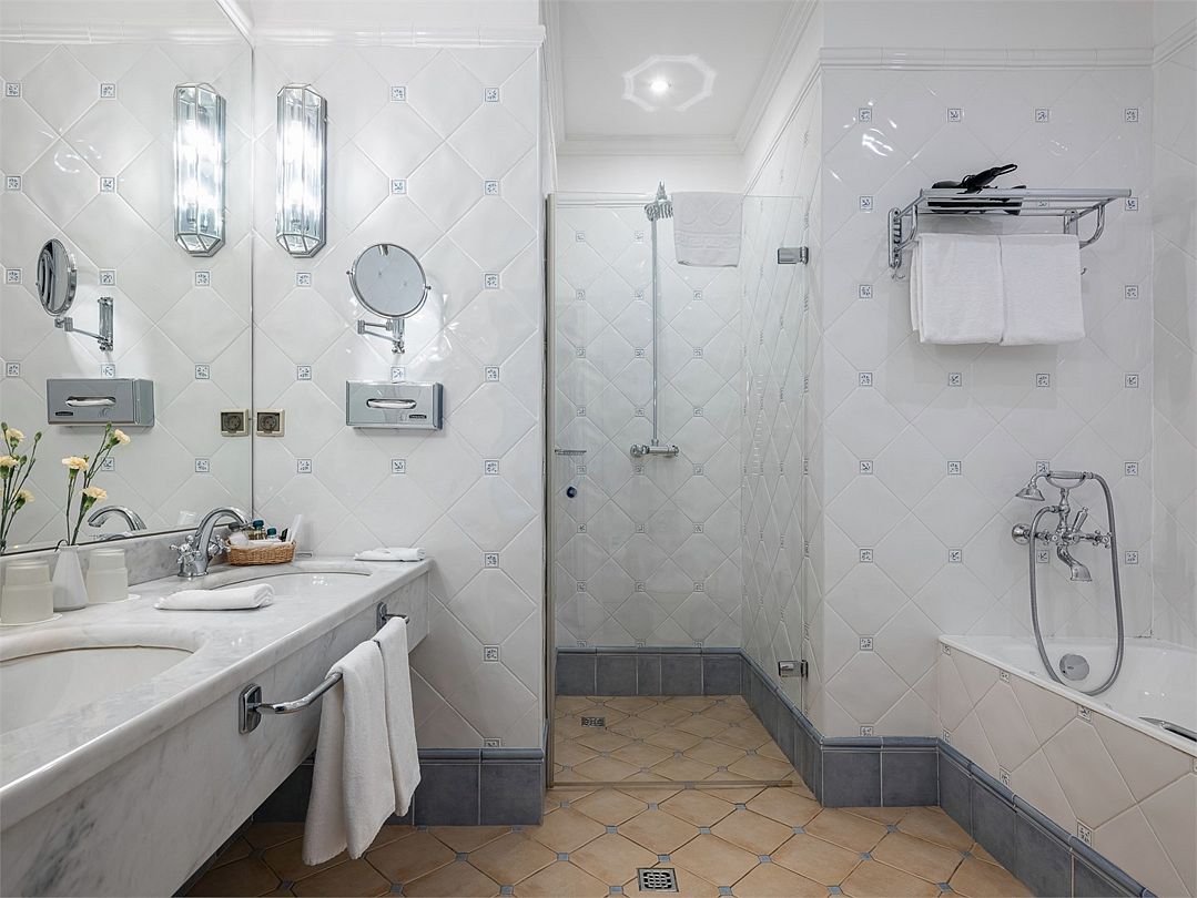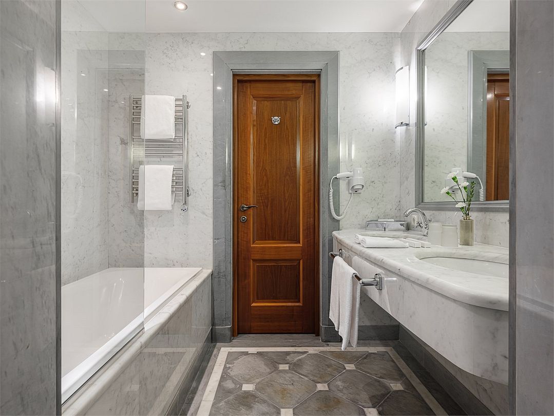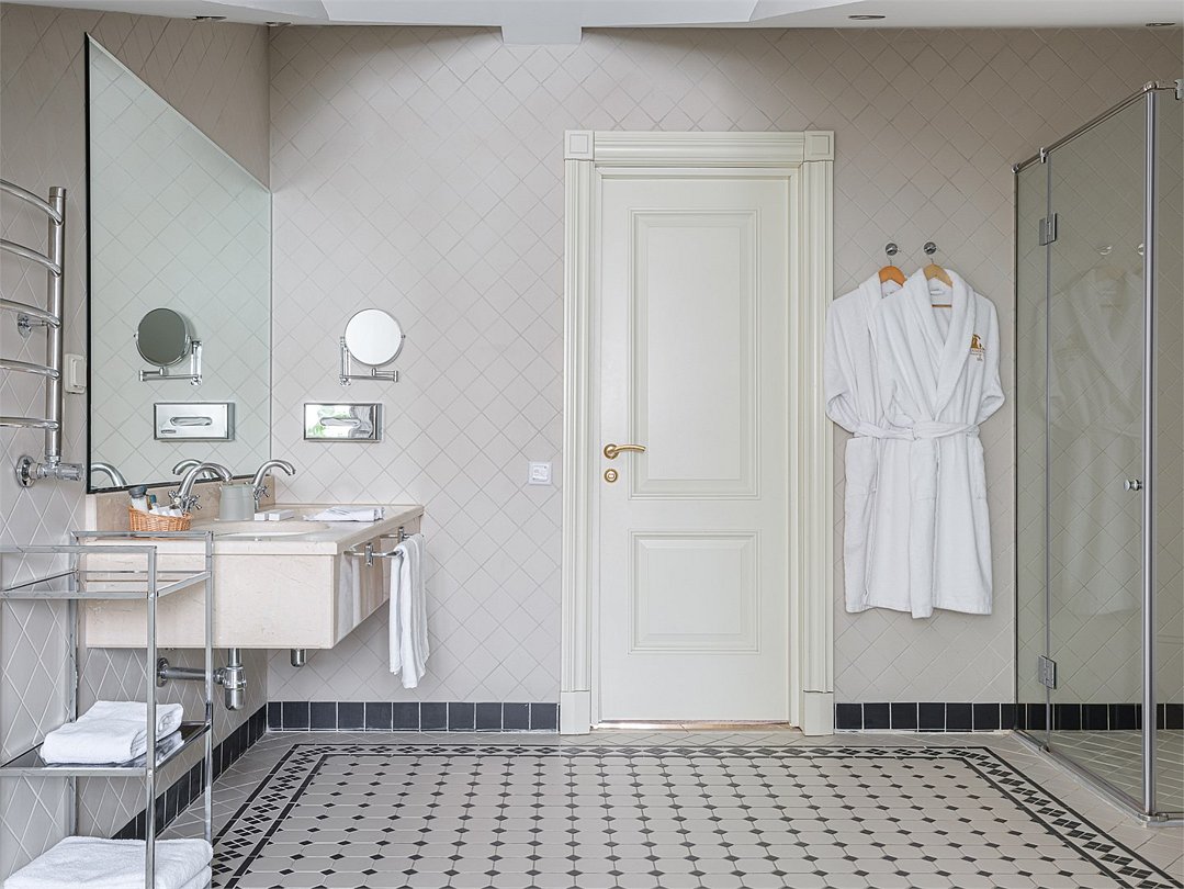 Удобная ванная комната с подогреваемым полом, душевой, комплектом хлопковых полотенец, халатами, тапочками и косметическими принадлежностями. Ресторанное обслуживание в номере 24 часа.