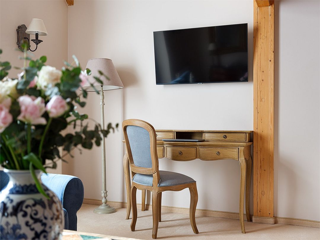 В номере большая двуспальная кровать, мягкая мебель, письменный стол, журнальный столик, LCD телевизор, комплементарный мини бар с ассортиментом безалкогольных напитков и легких закусок, сейф. В ванной комнате: ванна, душевая кабина, пол с подогревом, фен, набор хлопковых полотенец, халаты, тапочки и европейские косметические принадлежности. Ресторанное обслуживание в номере 24 часа.