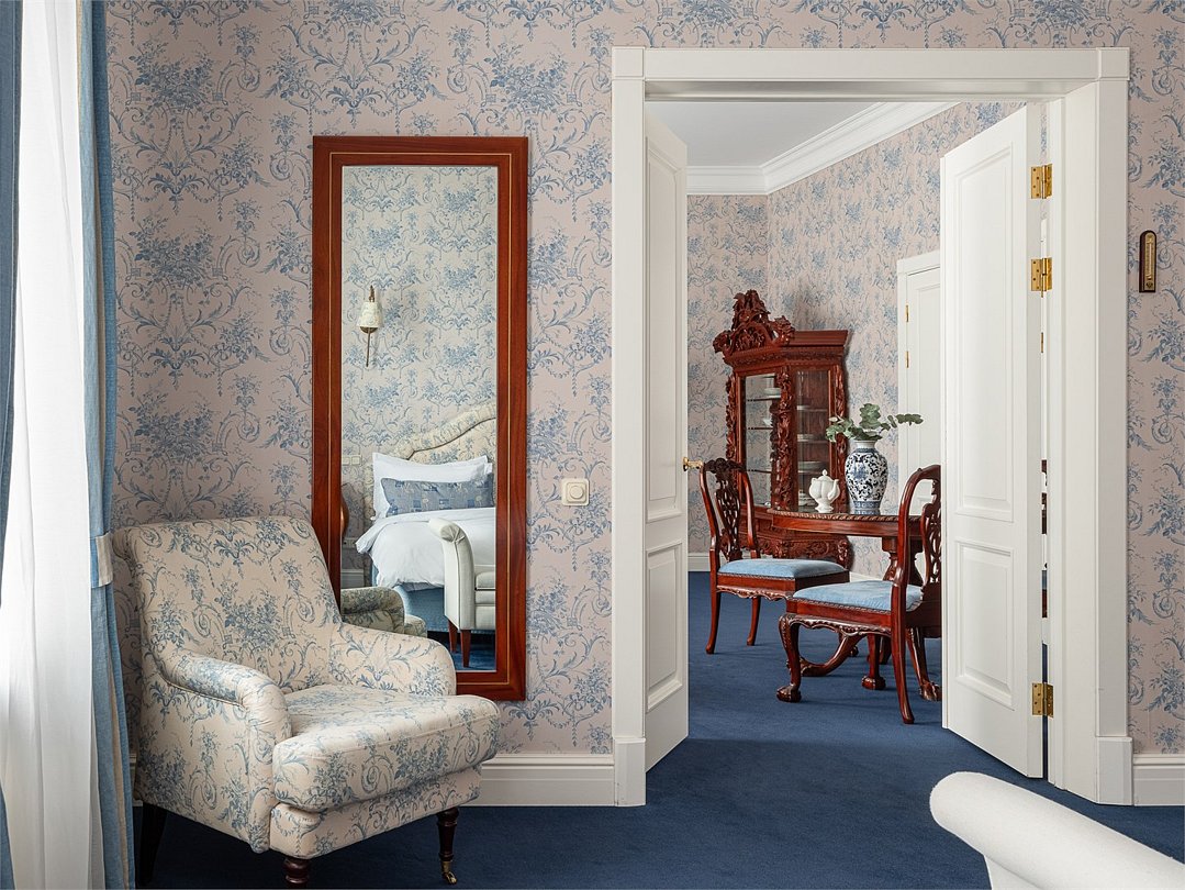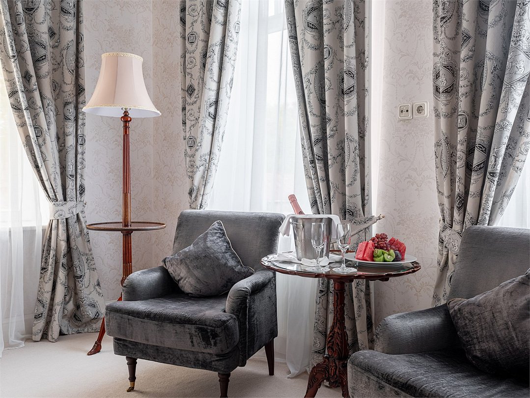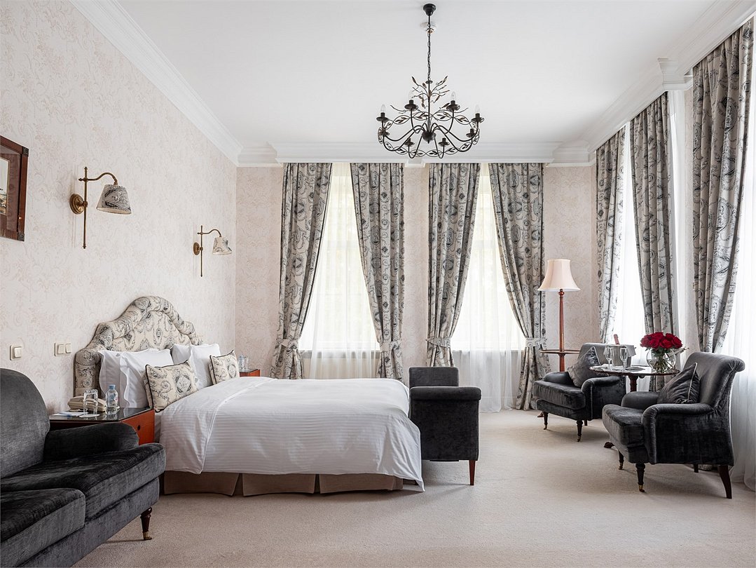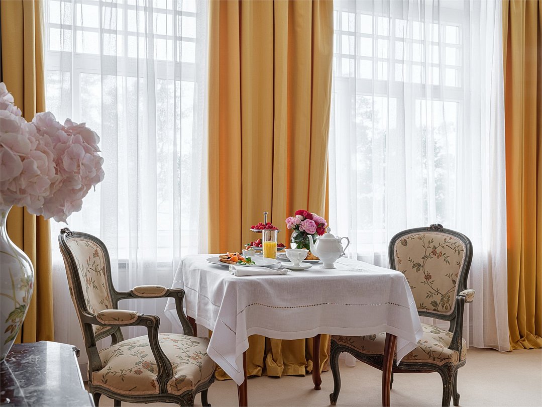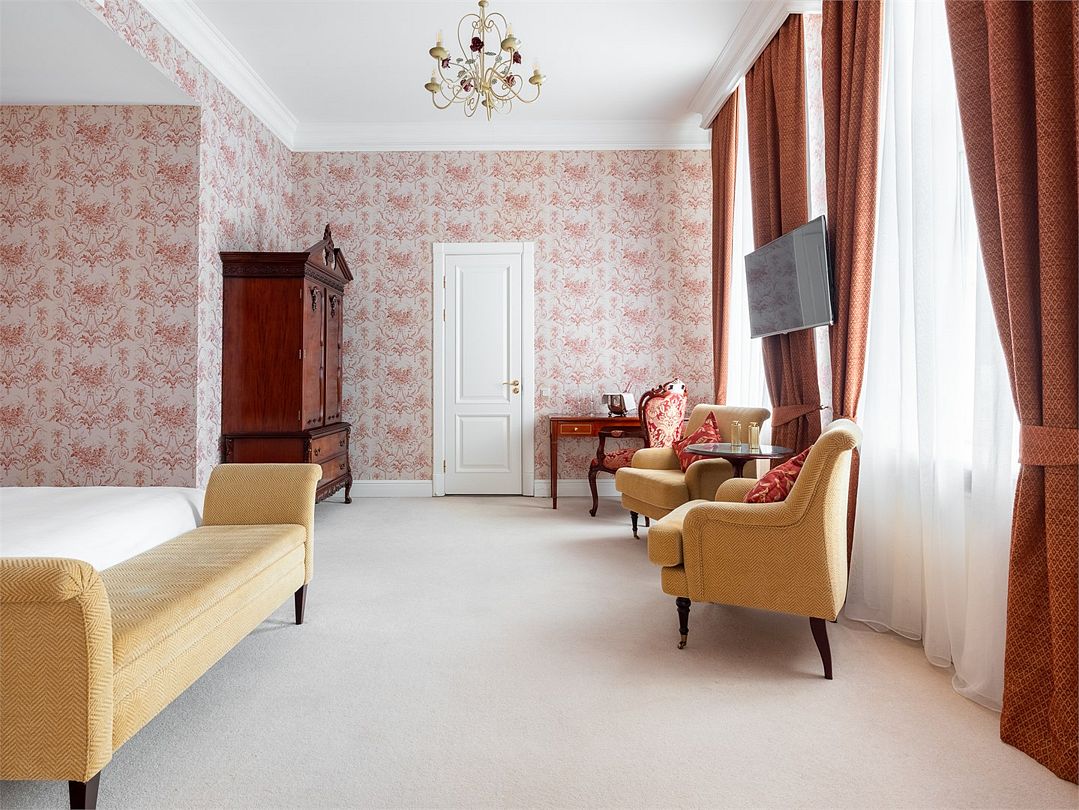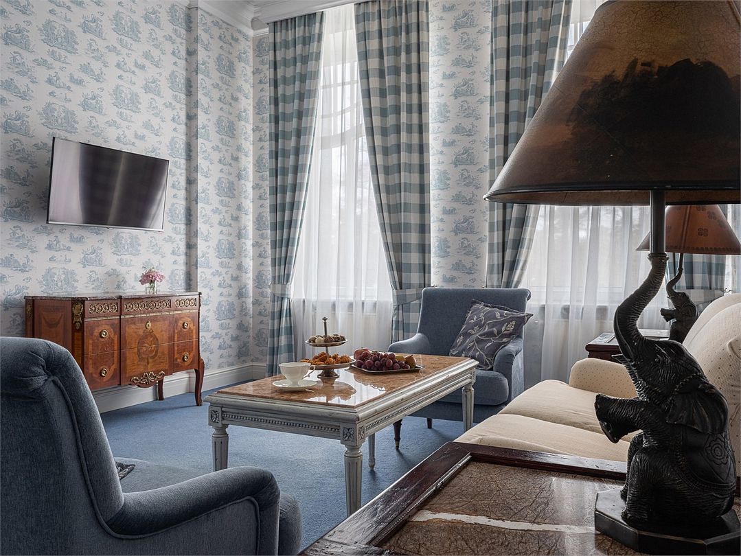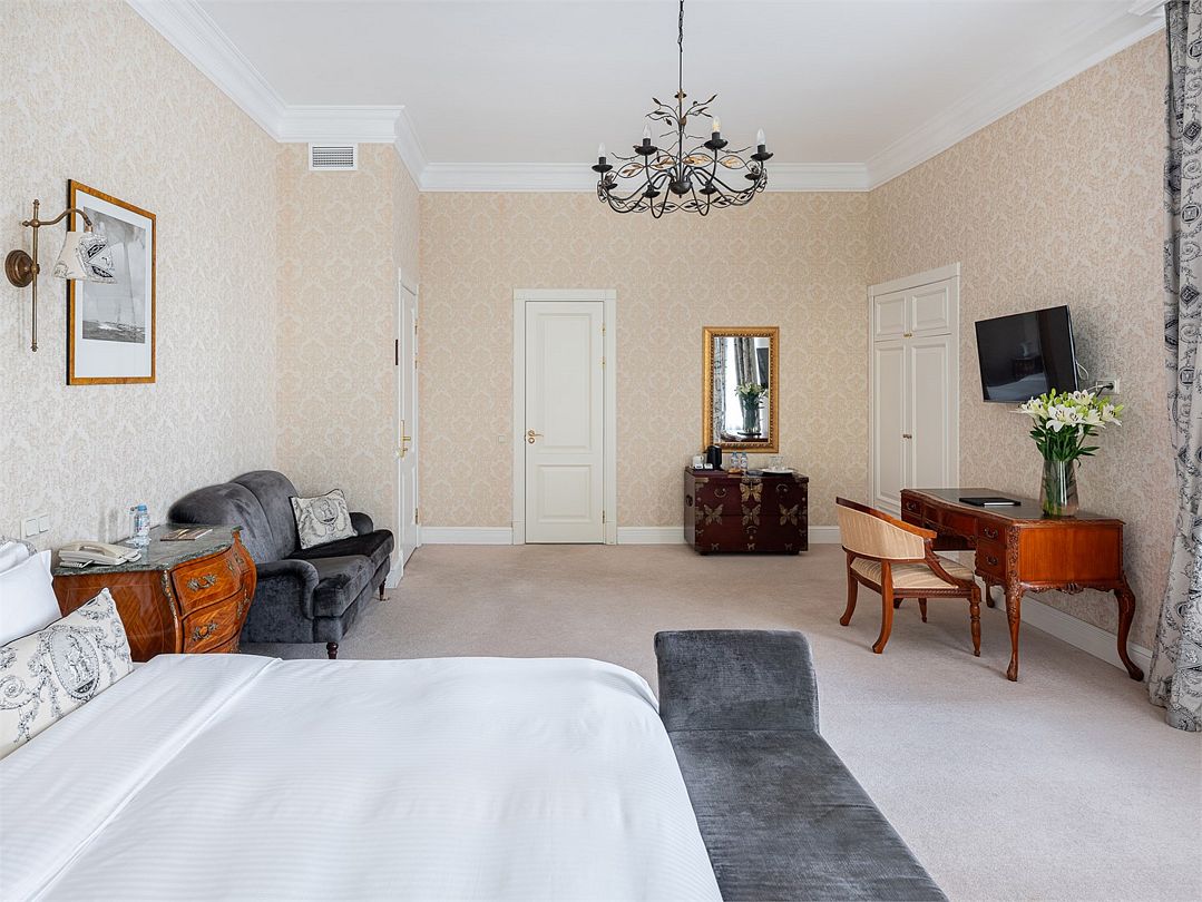Роскошный двухкомнатный люкс с видом на Финский Залив или Дачу Лихачева, площадью до 75 кв.м. Номер богато обставлен предметами антиквариата, в дизайне интерьера преобладает золотистое, голубое или коралловое цветовое решение. В номере большая двуспальная кровать, мягкая мебель, письменный стол, журнальный столик, встроенный гардероб с отделениями для багажа, телефон, LCD телевизор, мини бар с ассортиментом безалкогольных напитков и легких закусок, сейф. В ванной комнате: ванна, душевая кабина, фен, полы с подогревом, европейские косметические принадлежности, халаты, тапочки и набор хлопковых полотенец. Ресторанное обслуживание в номере 24 часа.