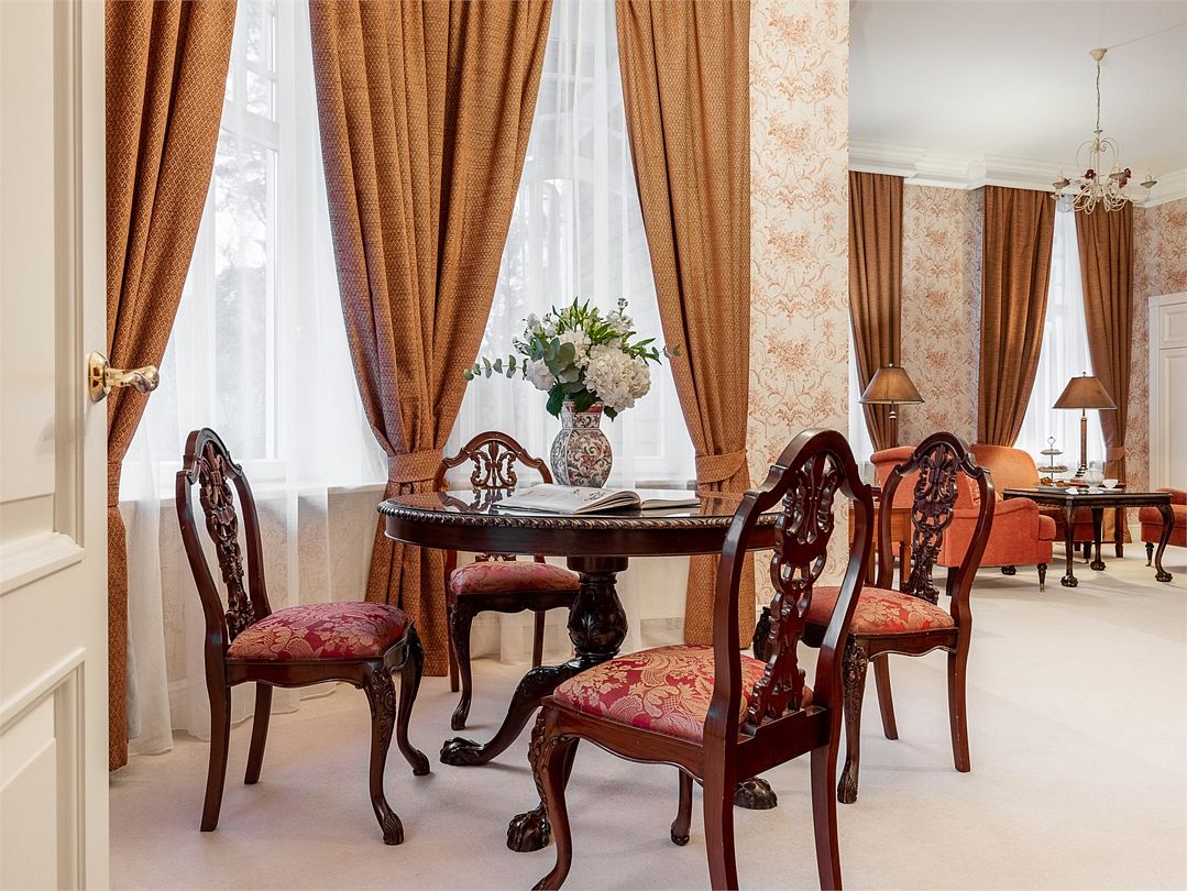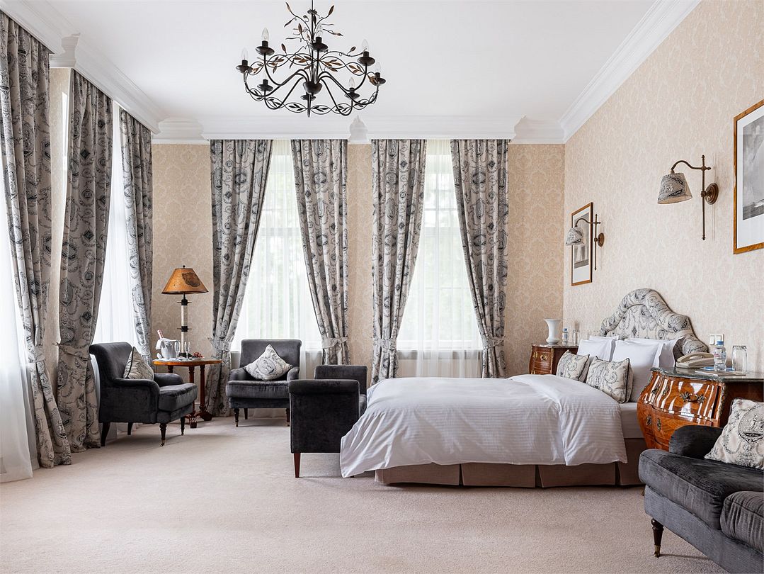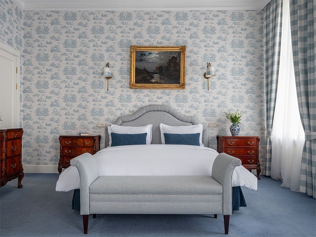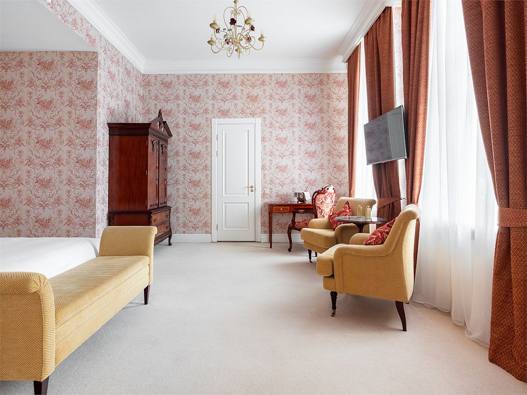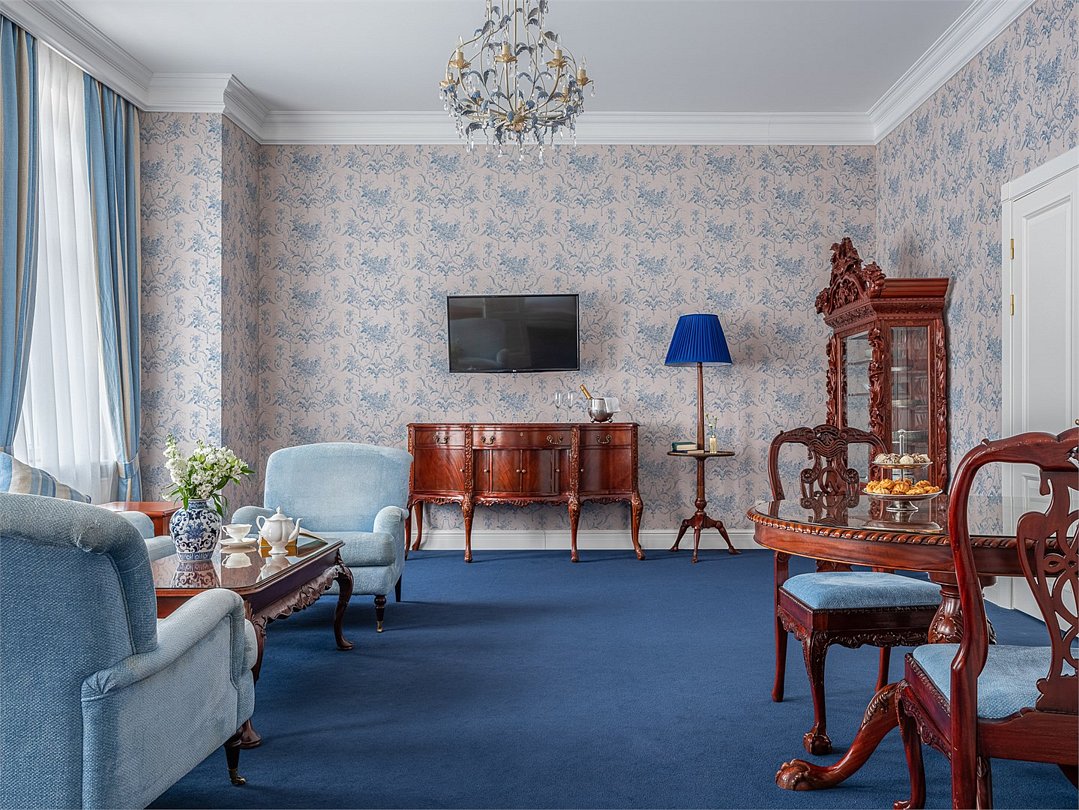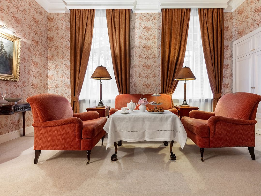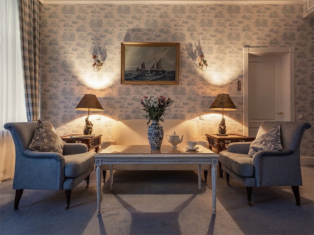 Роскошный двухкомнатный люкс с видом на Финский Залив или Дачу Лихачева, площадью до 75 кв.м. Номер богато обставлен предметами антиквариата, в дизайне интерьера преобладает золотистое, голубое или коралловое цветовое решение. В номере большая двуспальная кровать, мягкая мебель, письменный стол, журнальный столик, встроенный гардероб с отделениями для багажа, телефон, LCD телевизор, мини бар с ассортиментом безалкогольных напитков и легких закусок, сейф. В ванной комнате: ванна, душевая кабина, фен, полы с подогревом, европейские косметические принадлежности, халаты, тапочки и набор хлопковых полотенец. Ресторанное обслуживание в номере 24 часа.
