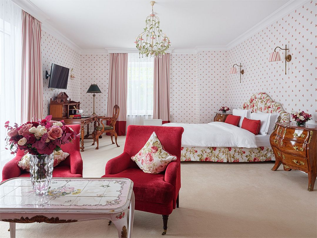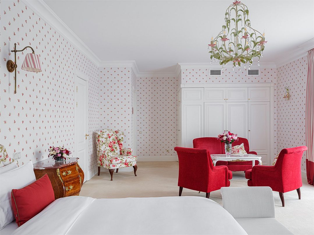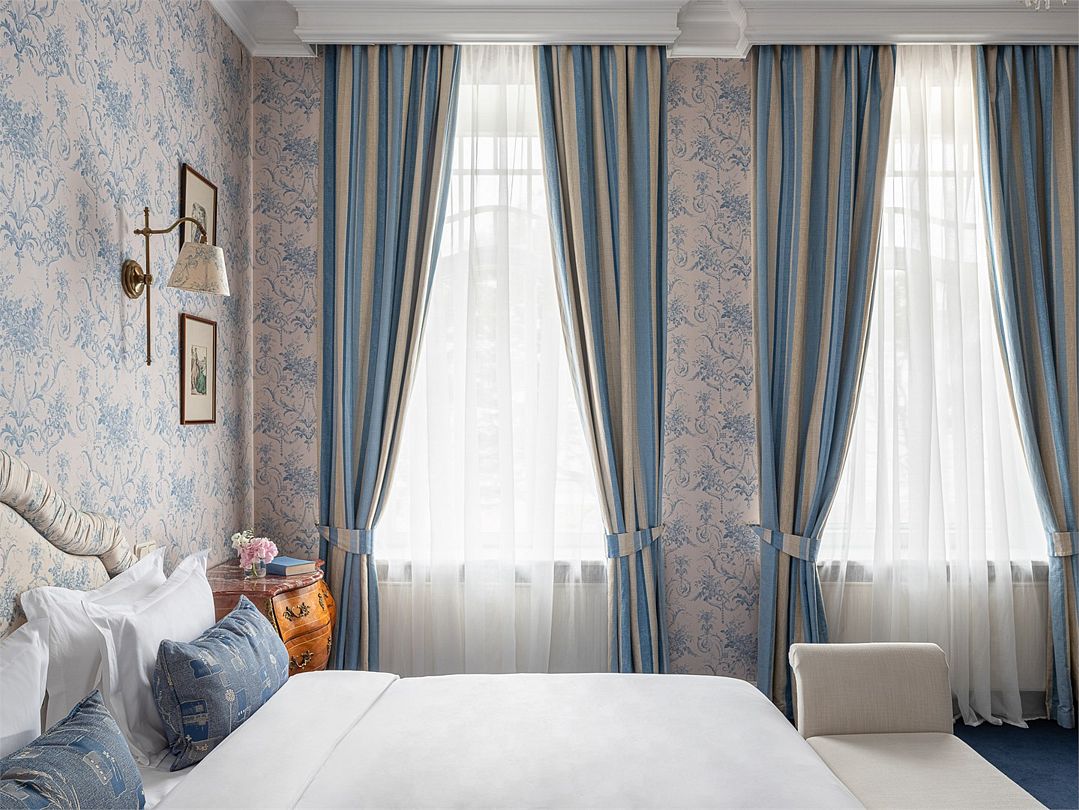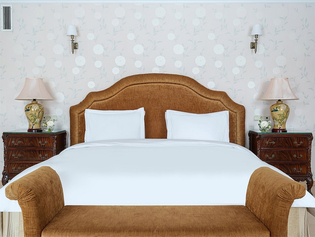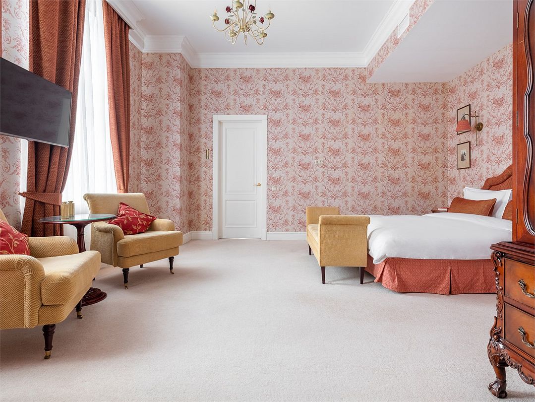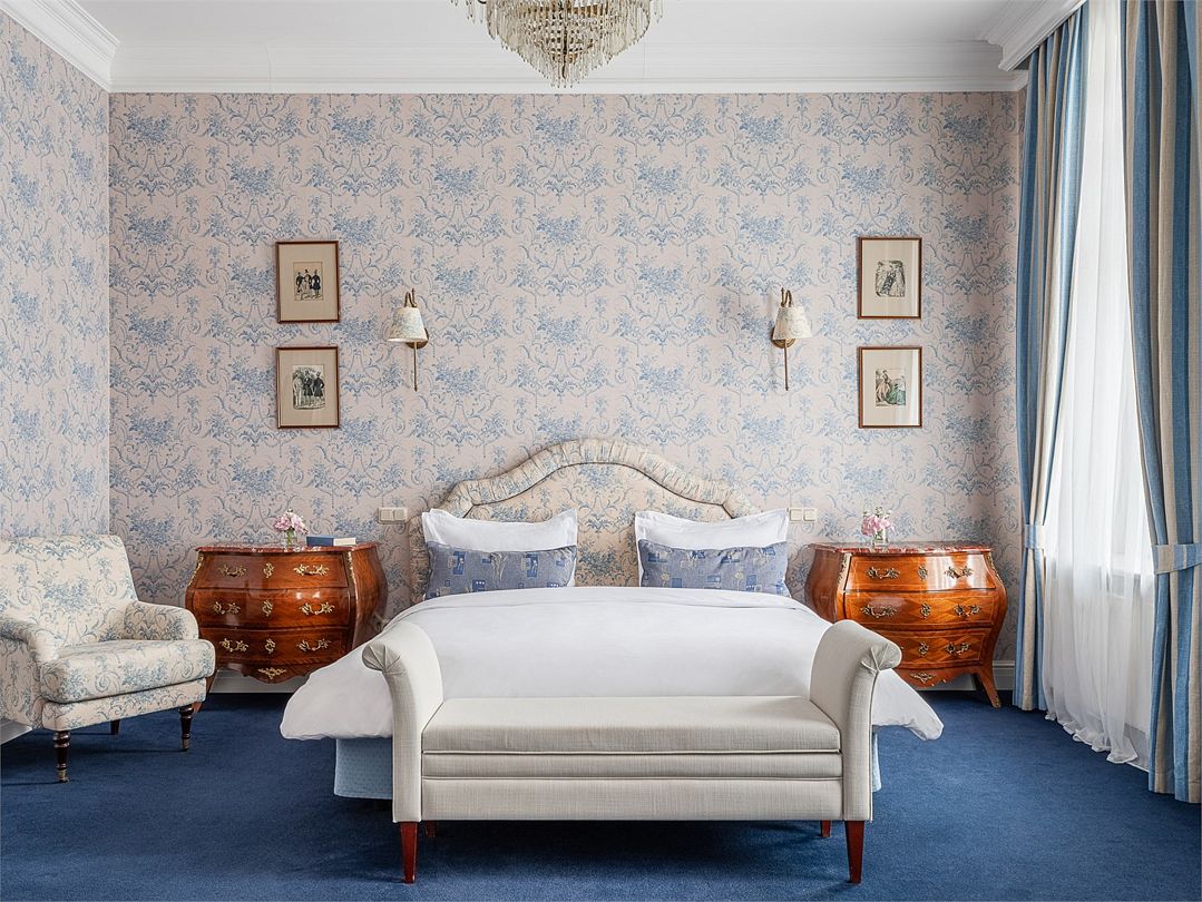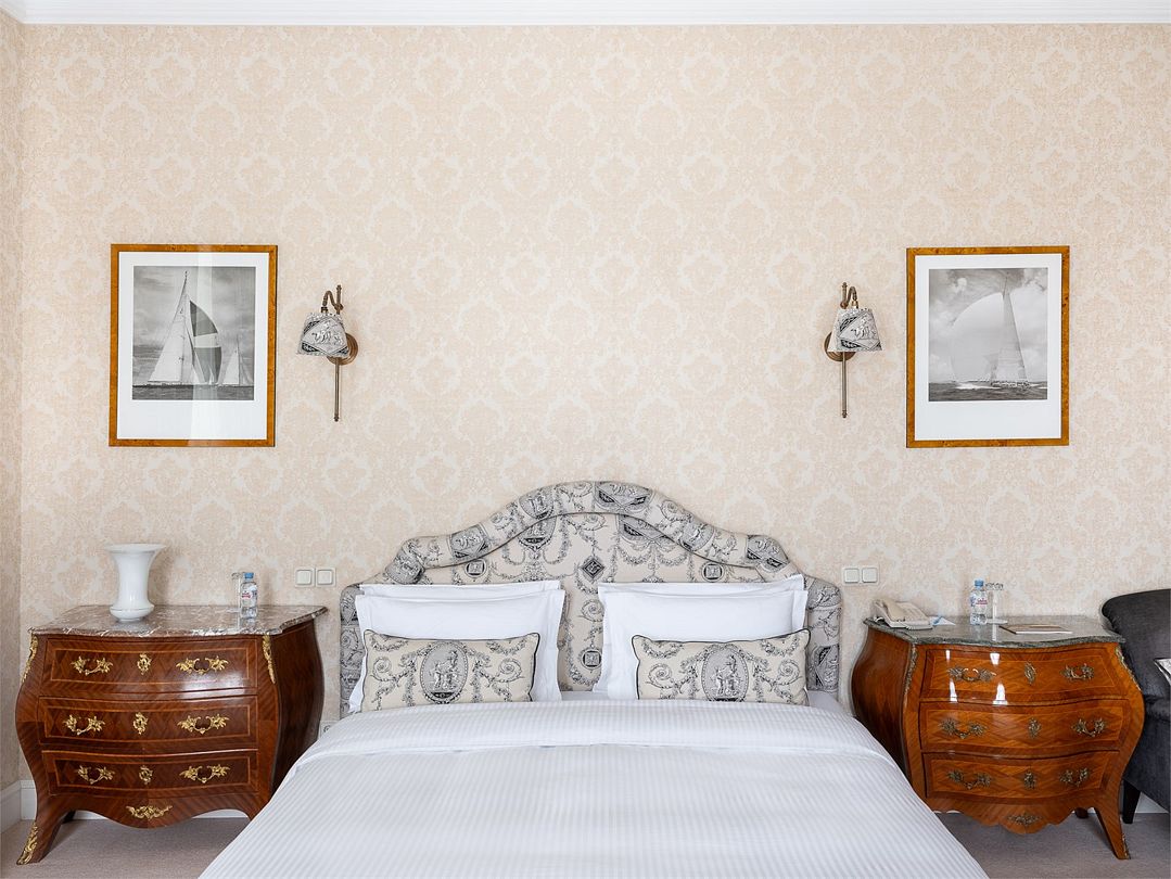 Роскошный двухкомнатный люкс с видом на Финский Залив или Дачу Лихачева, площадью до 75 кв.м. Номер богато обставлен предметами антиквариата, в дизайне интерьера преобладает золотистое, голубое или коралловое цветовое решение. В номере большая двуспальная кровать, мягкая мебель, письменный стол, журнальный столик, встроенный гардероб с отделениями для багажа, телефон, LCD телевизор, мини бар с ассортиментом безалкогольных напитков и легких закусок, сейф. В ванной комнате: ванна, душевая кабина, фен, полы с подогревом, европейские косметические принадлежности, халаты, тапочки и набор хлопковых полотенец. Ресторанное обслуживание в номере 24 часа.