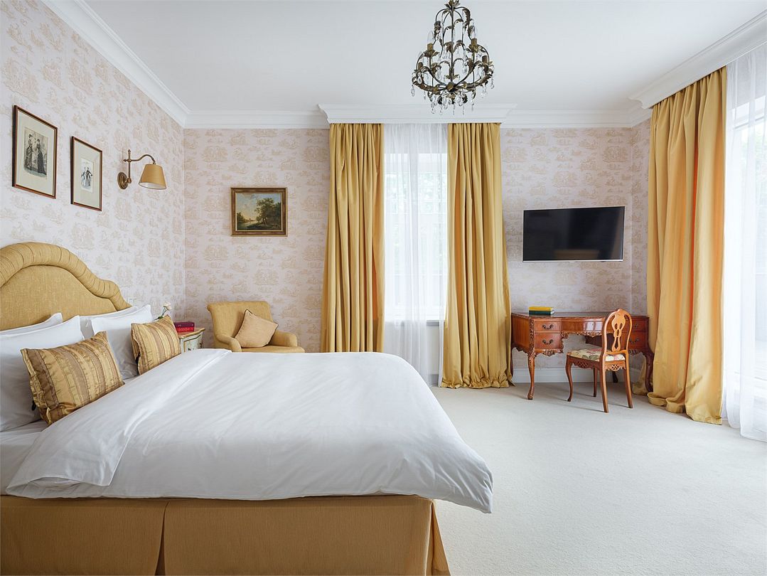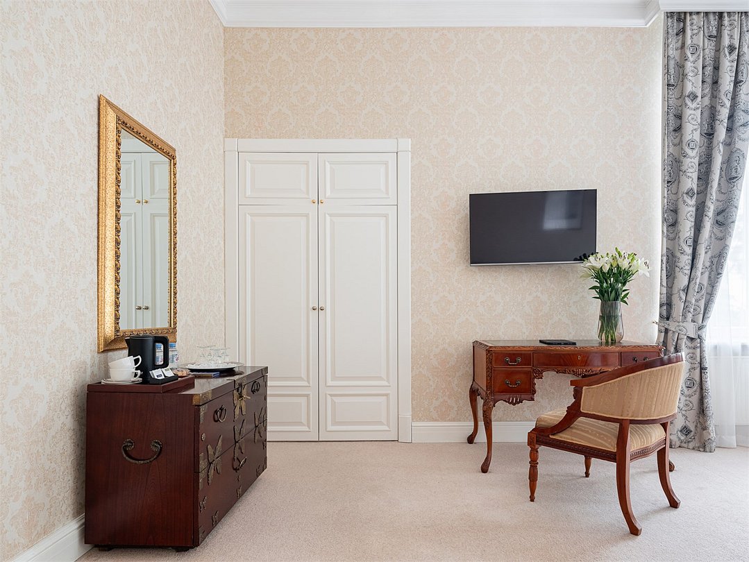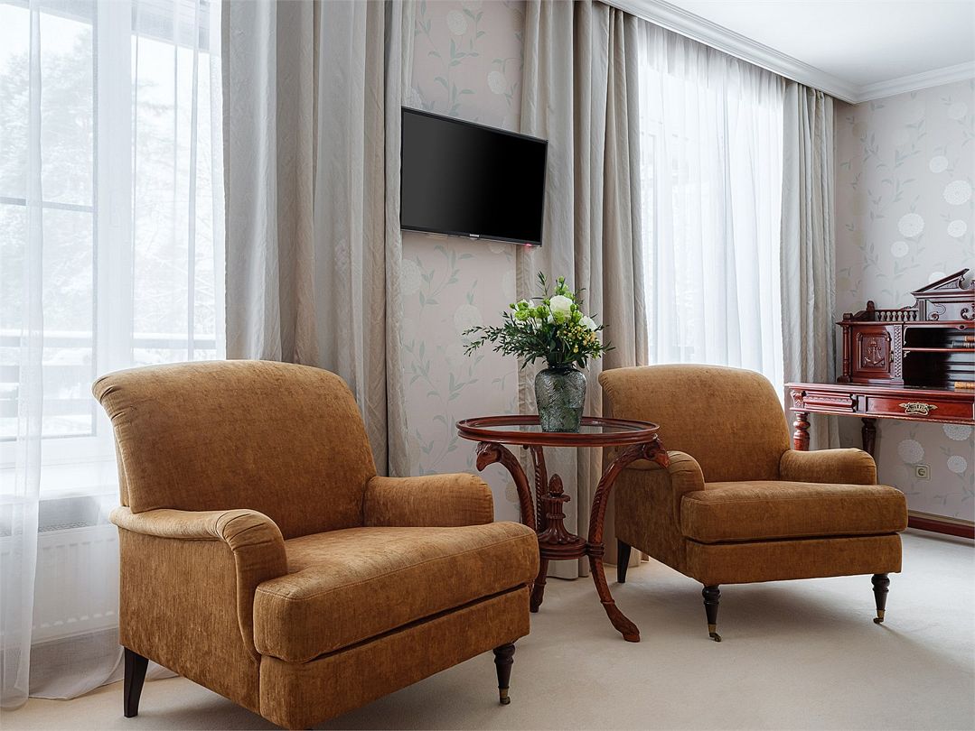 Однокомнатный сьют площадью более 40 кв.м., решенный в бежевых тонах, с видом на Финский Залив или Дачу Лихачева, декорированный предметами антиквариата и расположен на втором этаже Дачи Шелепина. В номере большая двуспальная кровать, мягкая мебель, письменный стол, журнальный столик, LCD телевизор, комплементарный мини бар с ассортиментом безалкогольных напитков и легких закусок, сейф. В ванной комнате: ванна, душевая кабина, пол с подогревом, фен, набор хлопковых полотенец, халаты, тапочки и европейские косметические принадлежности. Ресторанное обслуживание в номере 24 часа.