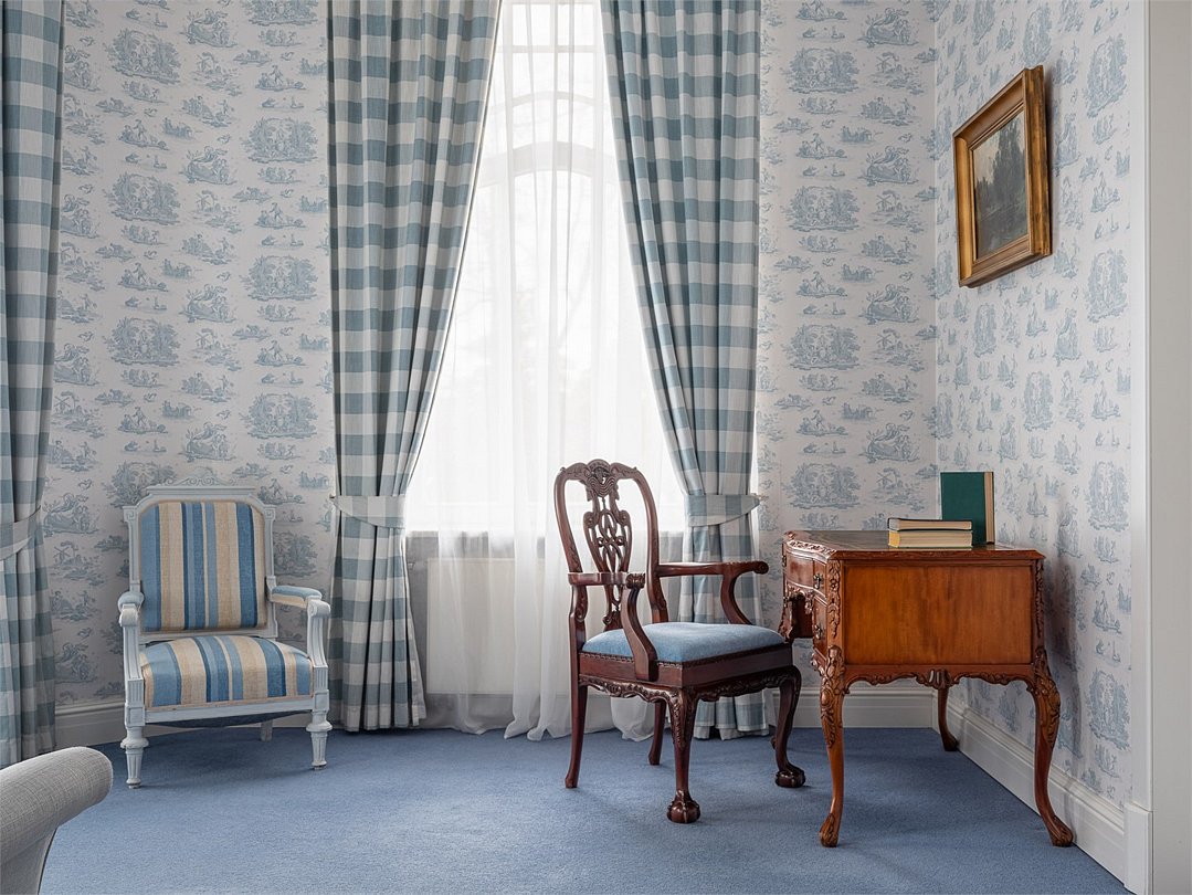 Роскошно оформленный двухкомнатный сьют площадью более 60 кв. м. расположен на втором этаже Дачи Шелепина, из номера открывается вид на Финский Залив. В дизайне интерьера преобладает голубое цветовое решение, и номер шикарно обставлен предметами антиквариата. В номере большая двуспальная кровать, мягкая мебель, письменный стол, журнальный столик, встроенный гардероб с отделениями для багажа, телефон, беспроводной доступ в Интернет, LCD телевизор, сейф, комплементарный мини бар с ассортиментом безалкогольных напитков и легких закусок. В ванной комнате: ванна, душевая кабина, фен, полы с подогревом, набор хлопковых полотенец, халаты, тапочки и европейские косметические принадлежности. Ресторанное обслуживание в номере 24 часа.