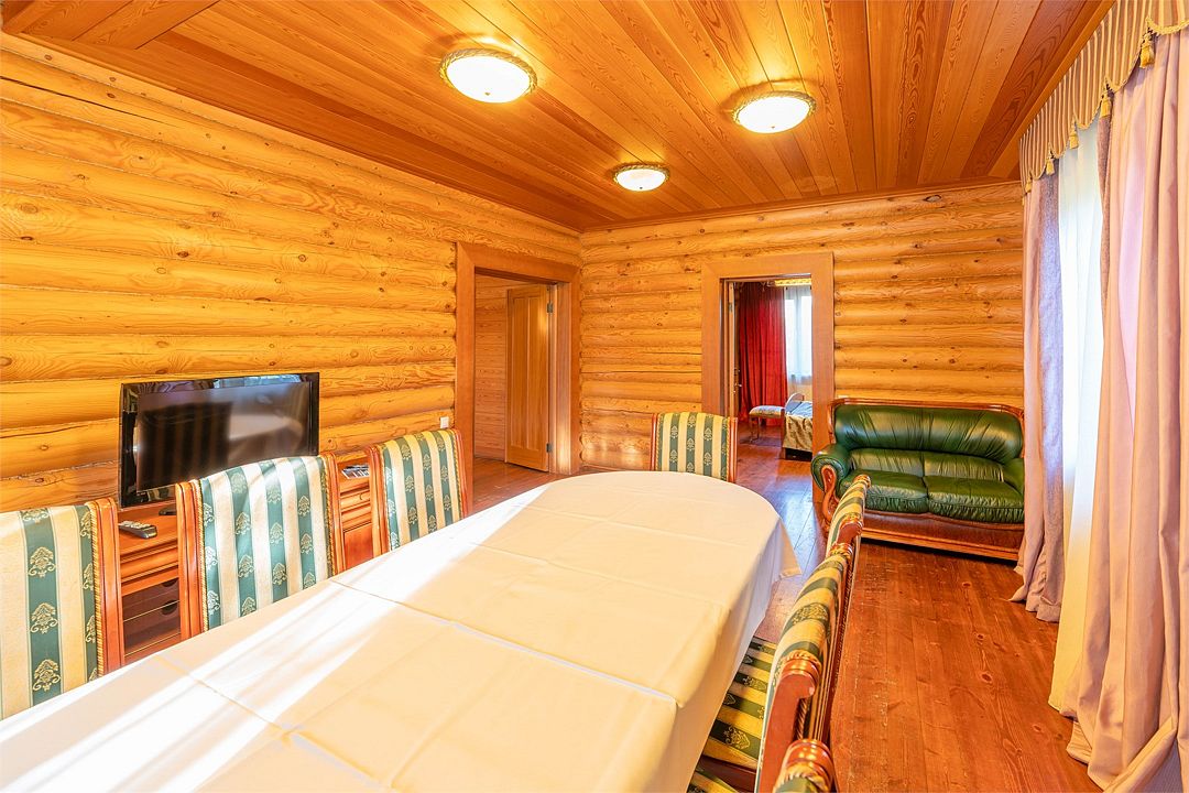 Номер оснащен гостиной с мягкой мебелью и рабочим столом, двумя спальными комнатами с одной большой кроватью с удобным матрацем, двумя ванными комнатами. Из больших панорамных окон открывается вид на хвойный лес или на живописную территорию клуба.