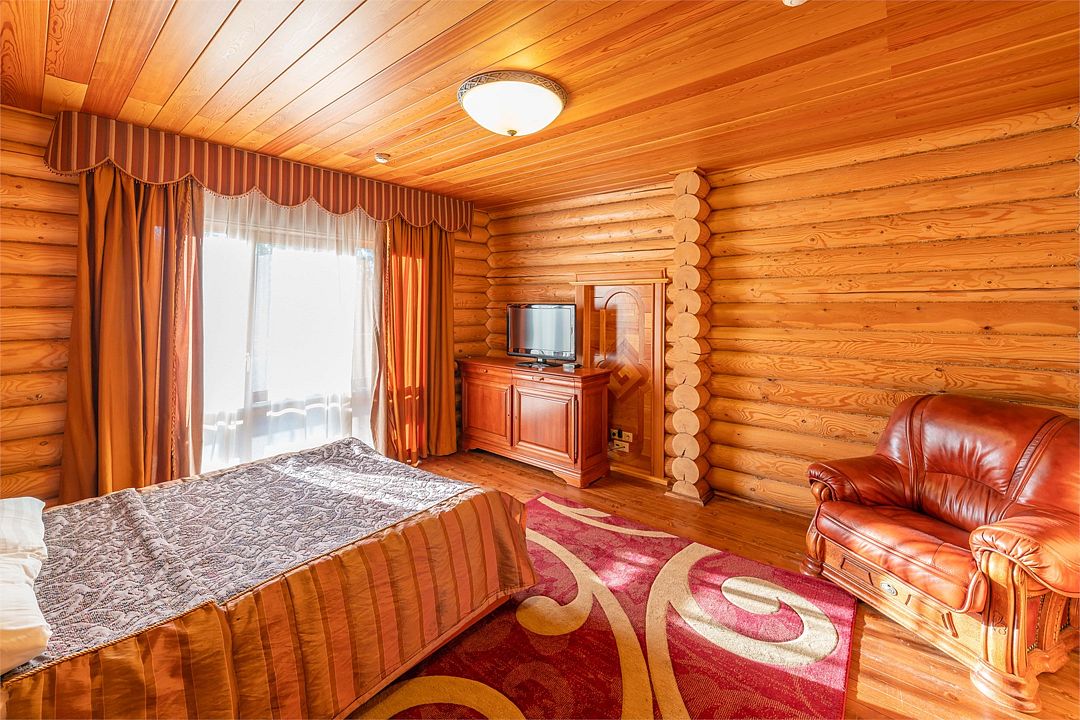 Номер оснащен одной большой кроватью с удобным матрацем, ванной комнатой, гостевой зоной с мягкими креслами. Из больших панорамных окон открывается вид на хвойный лес или на живописную территорию клуба.