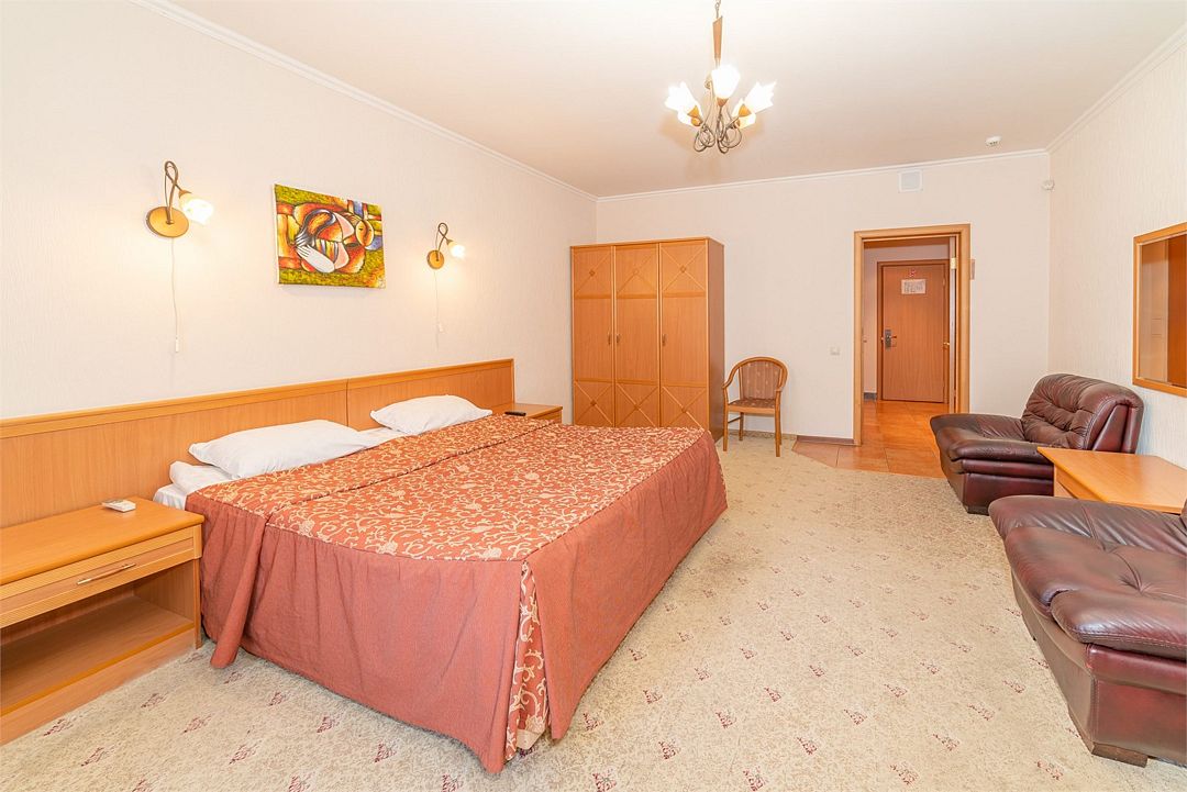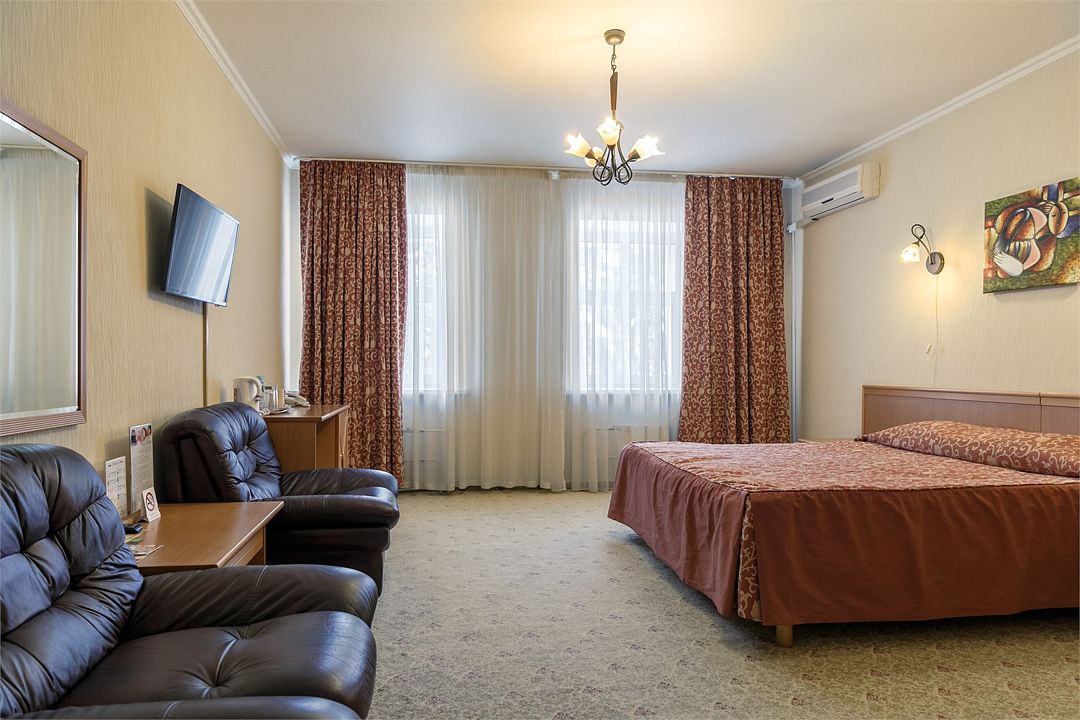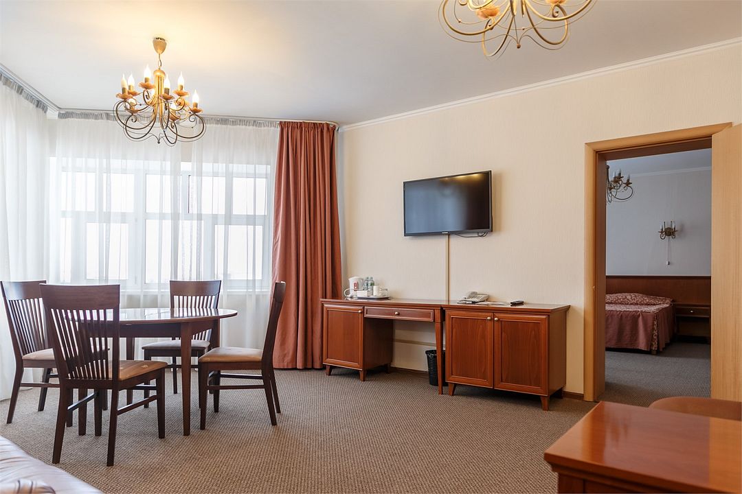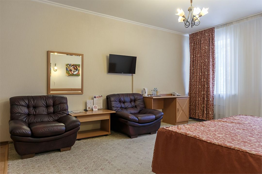 Уютный и функциональный двухкомнатный номер, выполненный в теплых бежевых и бордовых тонах. Здесь есть все необходимое для комфортного отдыха и работы.