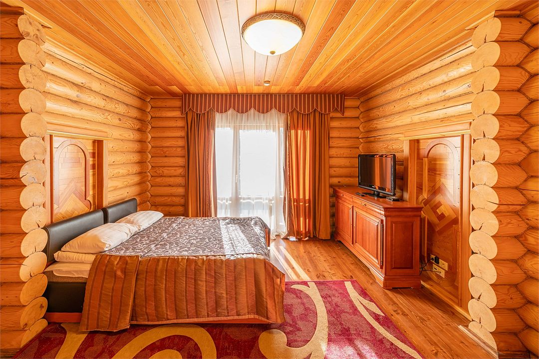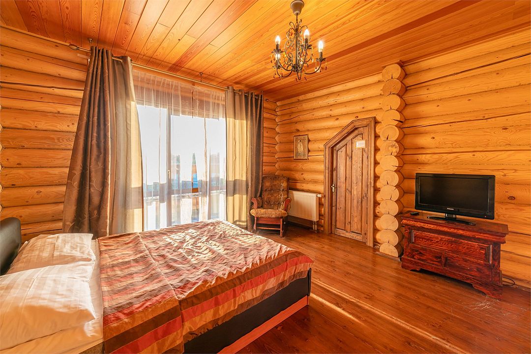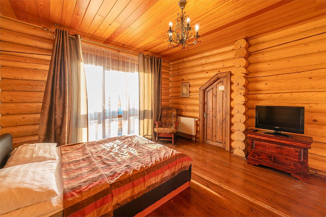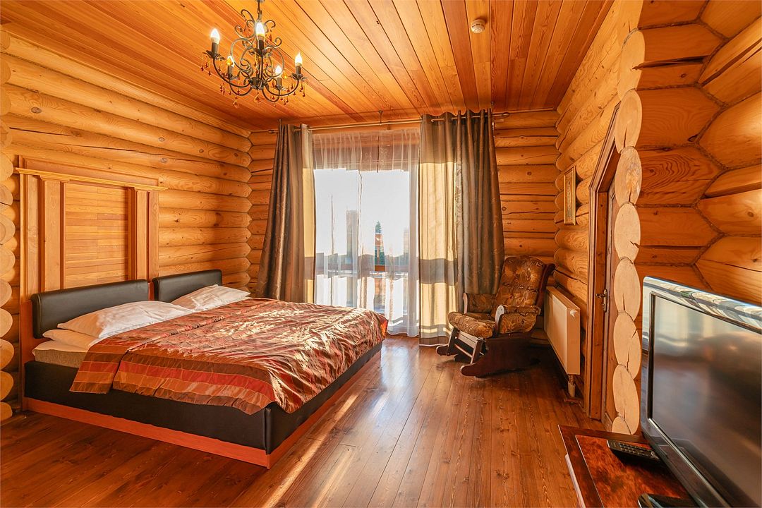 Номер оснащен гостиной с мягкой мебелью и рабочим столом, спальной комнатой с одной большой кроватью с удобным матрацем, ванной комнатой. Из больших панорамных окон открывается вид на хвойный лес или на живописную территорию клуба.
