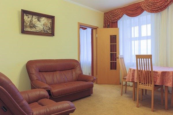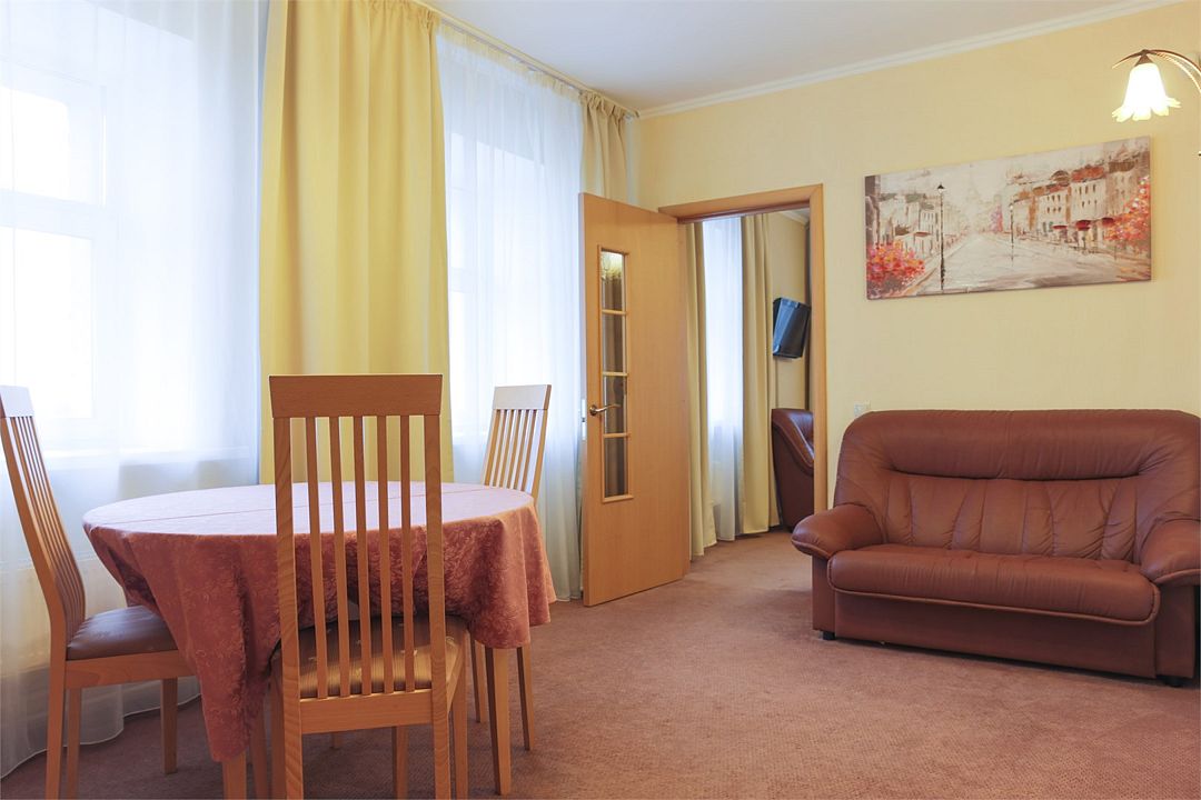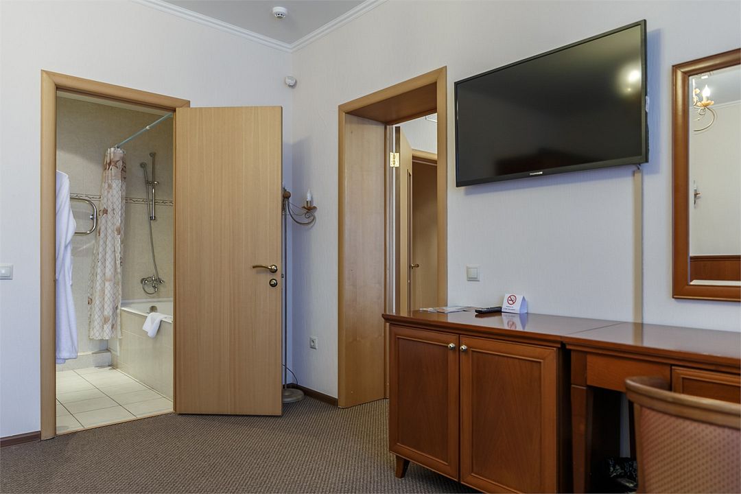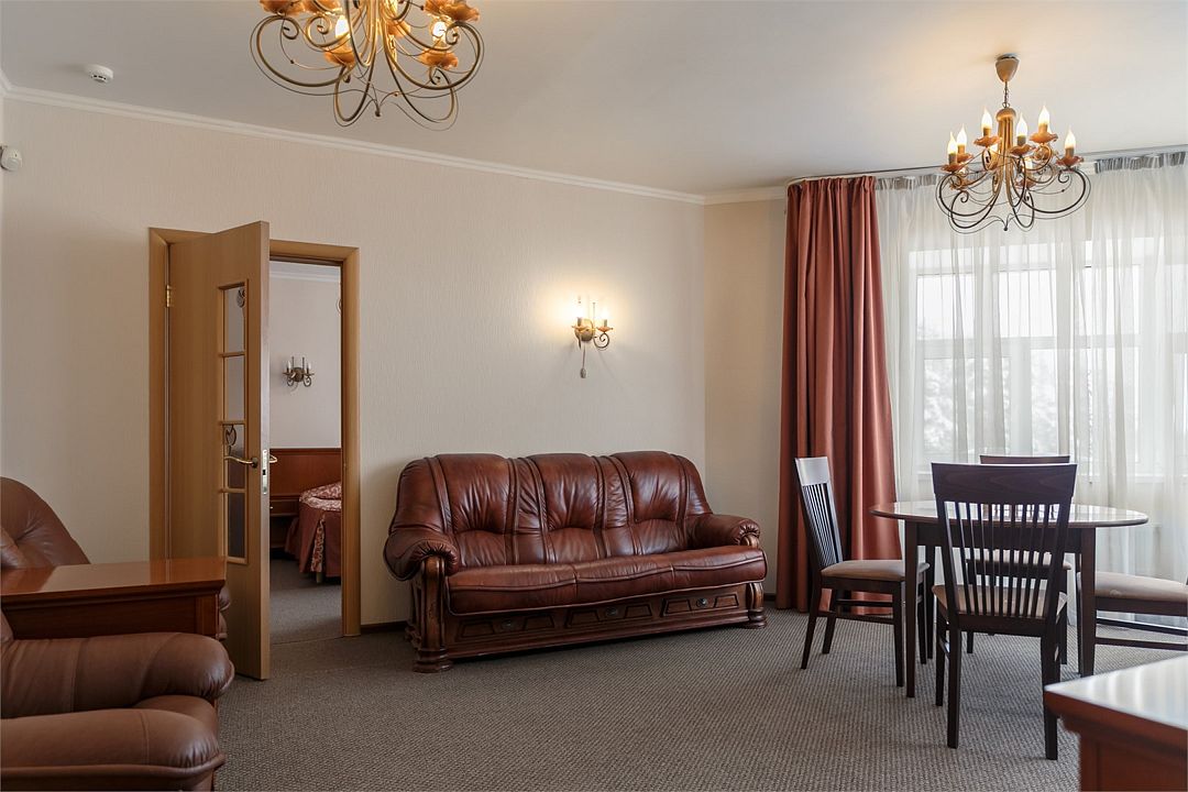 Уютный и функциональный трехкомнатный номер, выполненный в тёплых бежевых и бордовых тонах. Здесь есть все необходимое для комфортного отдыха и работы.