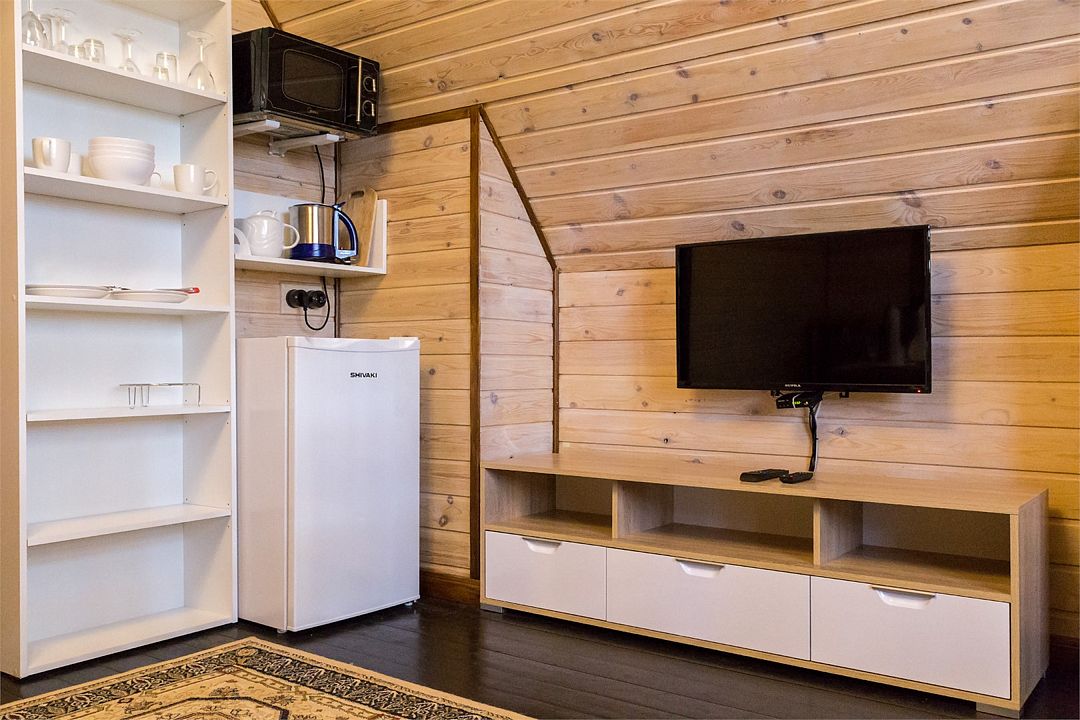 Для максимального комфорта гостей предусмотрены телевизор с кабельным вещанием, холодильник, микроволновая печь и чайник. Косметические принадлежности и купель добавляют нотку роскоши, делая отдых незабываемым и наполненным уютом.