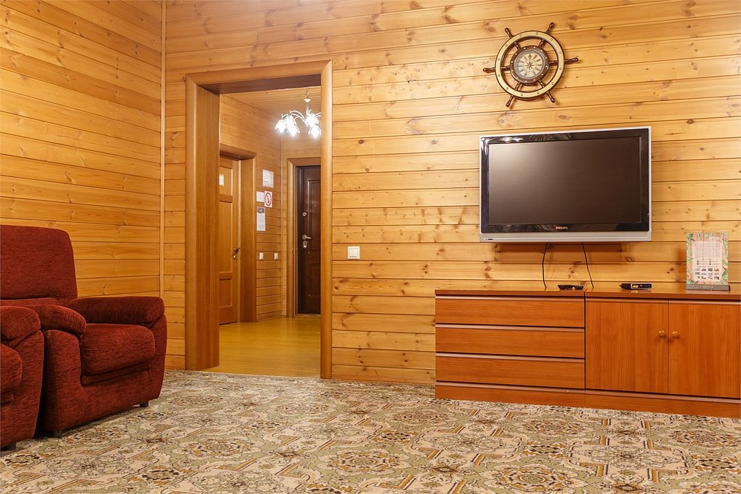 Современный деревянный коттедж в Подмосковье для большой компании оснащен всем необходимым для комфортного загородного отдыха: первой гостиной до двадцати пяти человек, четырьмя спальными комнатами с двуспальными кроватями, двумя гостиными с раскладными диванами, первой ванной комнатой с душевой кабиной, двумя туалетными комнатами, кухней, необходимой техникой, зоной барбекю, телевизором.