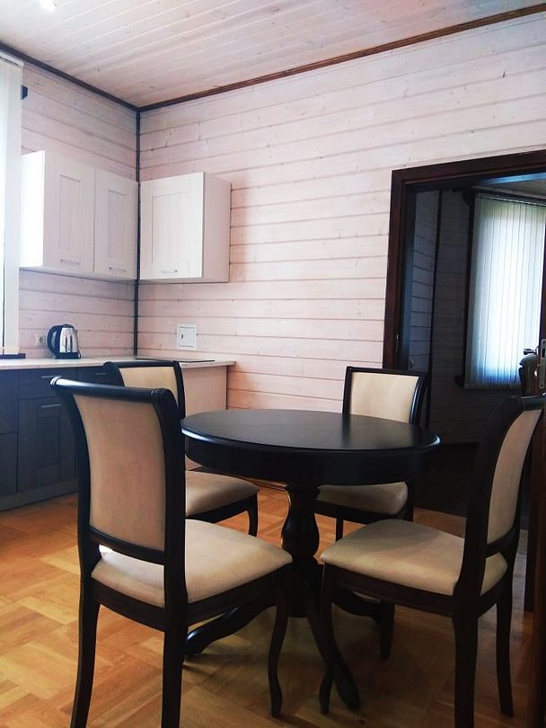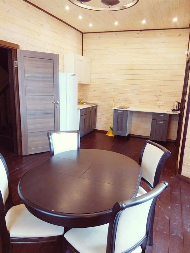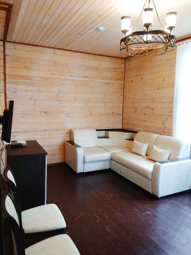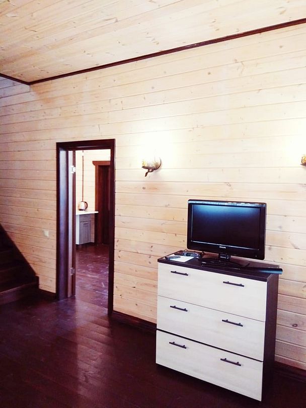 Современный 2-х этажный деревянный коттедж в Подмосковье для большой компании. Оснащен необходимой мебелью и оборудованием для комфортного загородного отдыха: 2-мя гостиными (1-ой — с обеденной зоной и столом на 10 человек), 5-ю спальными комнатами с двухместными кроватями, 1-ой ванной комнатой с душевой кабиной, 2-мя туалетными комнатами, кухней с необходимым оборудованием для приготовления еды, а также беседкой с зоной барбекю, 3-мя ТВ.