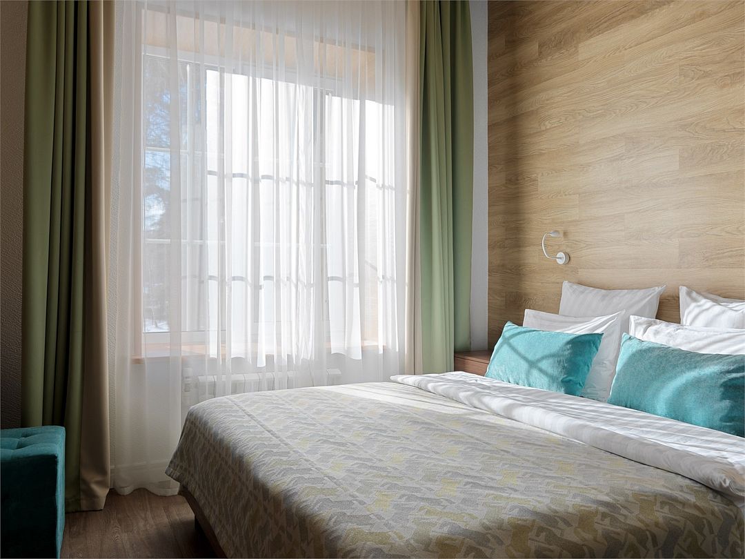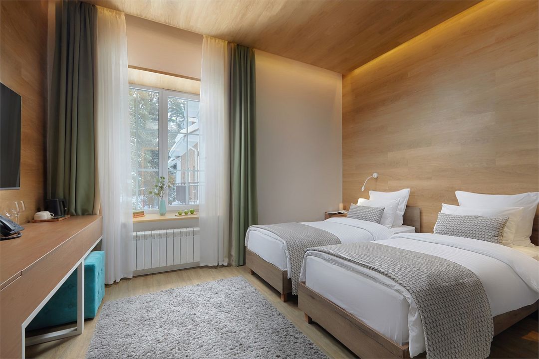 Однокомнатный комфортабельный и уютный номер, можно выбрать одну двуспальную или две раздельные кровати (уточнить наличие можно в гостинице), телевизор, шкаф, а также просторная душевая комната. Характеристики номеров могут отличаться.