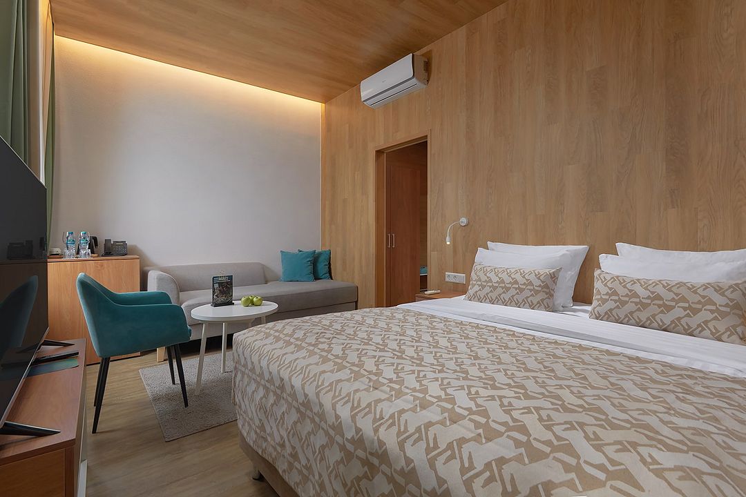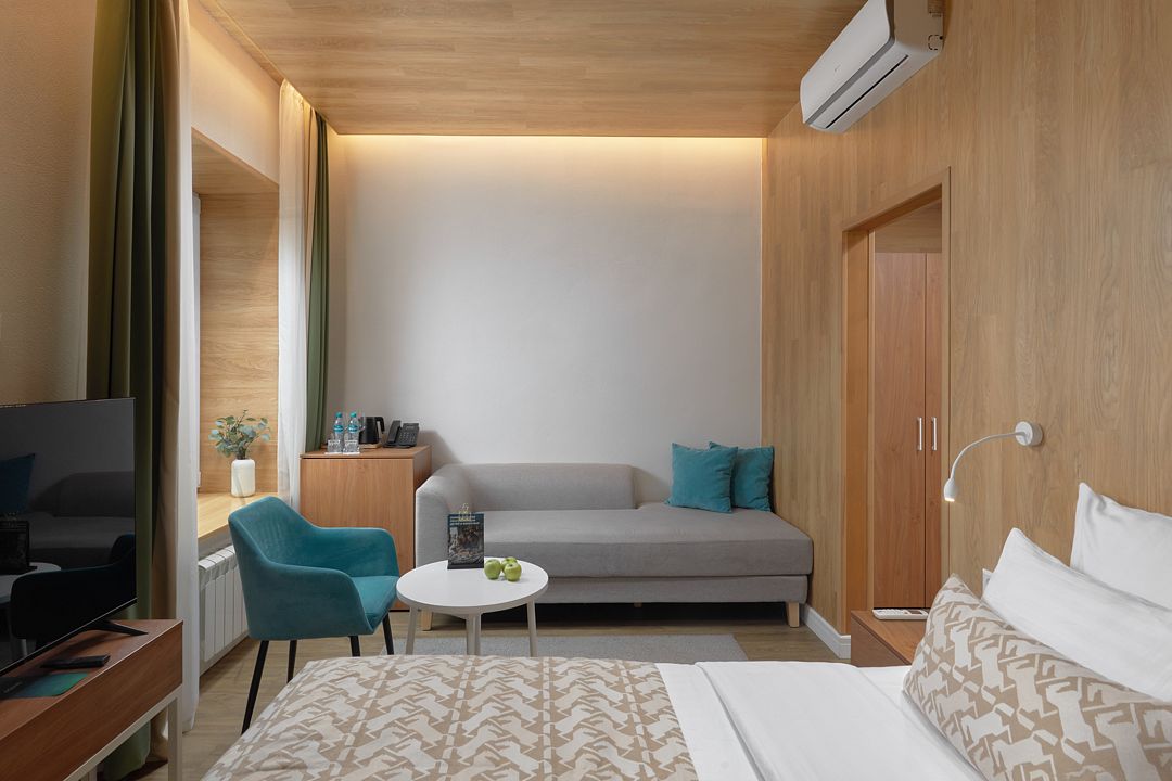 Просторный однокомнатный номер с одной большой кроватью, диваном-кушеткой и душем в ванной комнате. Характеристики номеров могут отличаться.