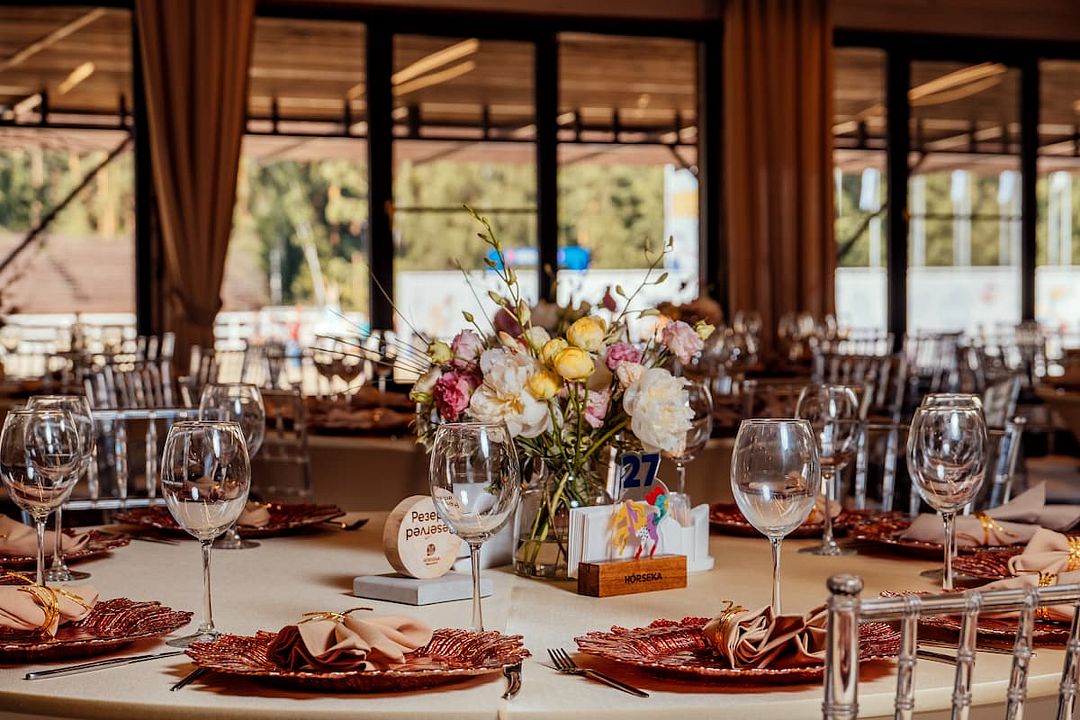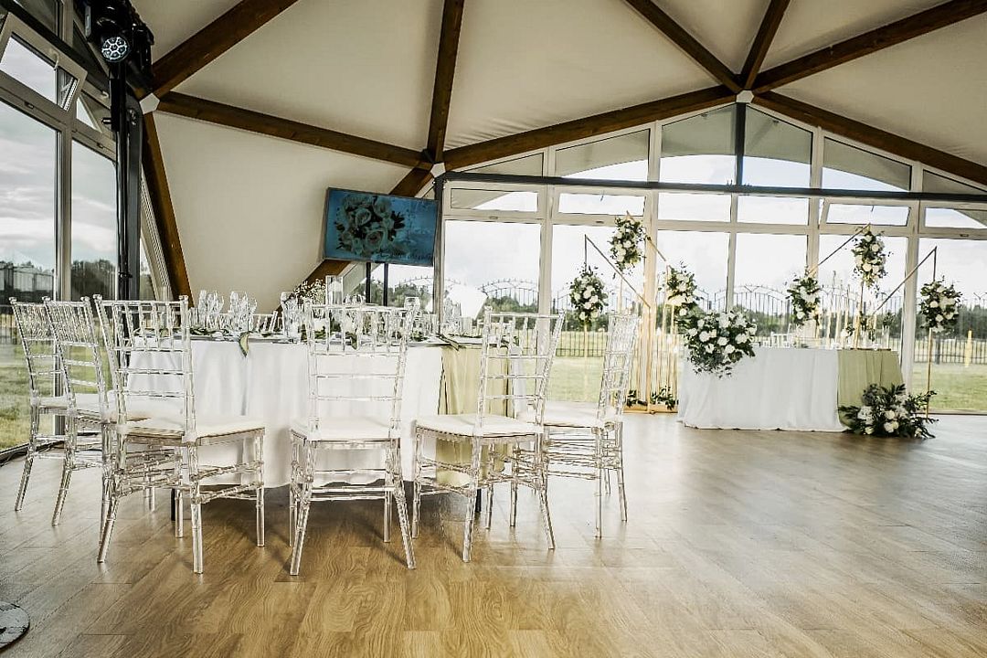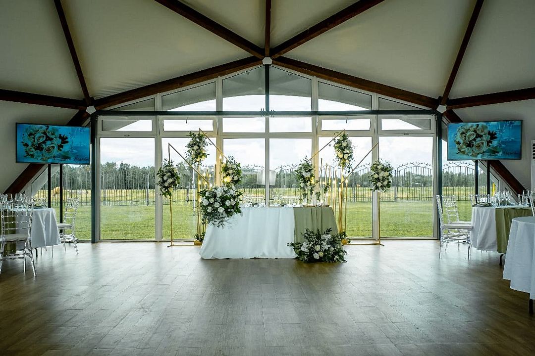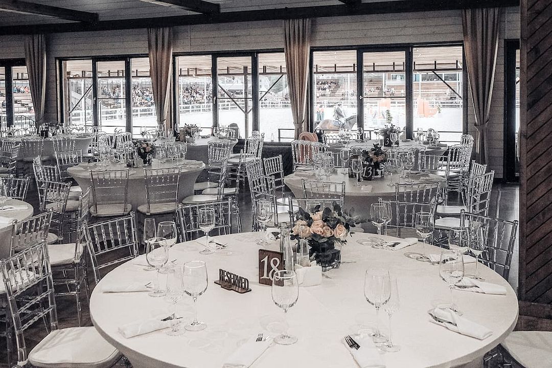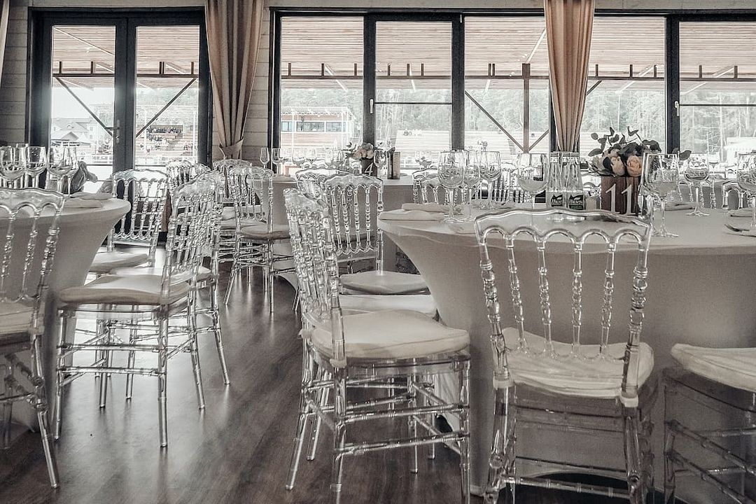 Банкетный зал «Фаворит» представляет собой просторное и светлое пространство с панорамными окнами, которые открывают захватывающий вид на зимний каток и летнюю тренировочную площадку для конного спорта. Уникальный интерьер создает атмосферу уюта и веселья, а современное оборудование обеспечивает комфорт для организации праздничных мероприятий.