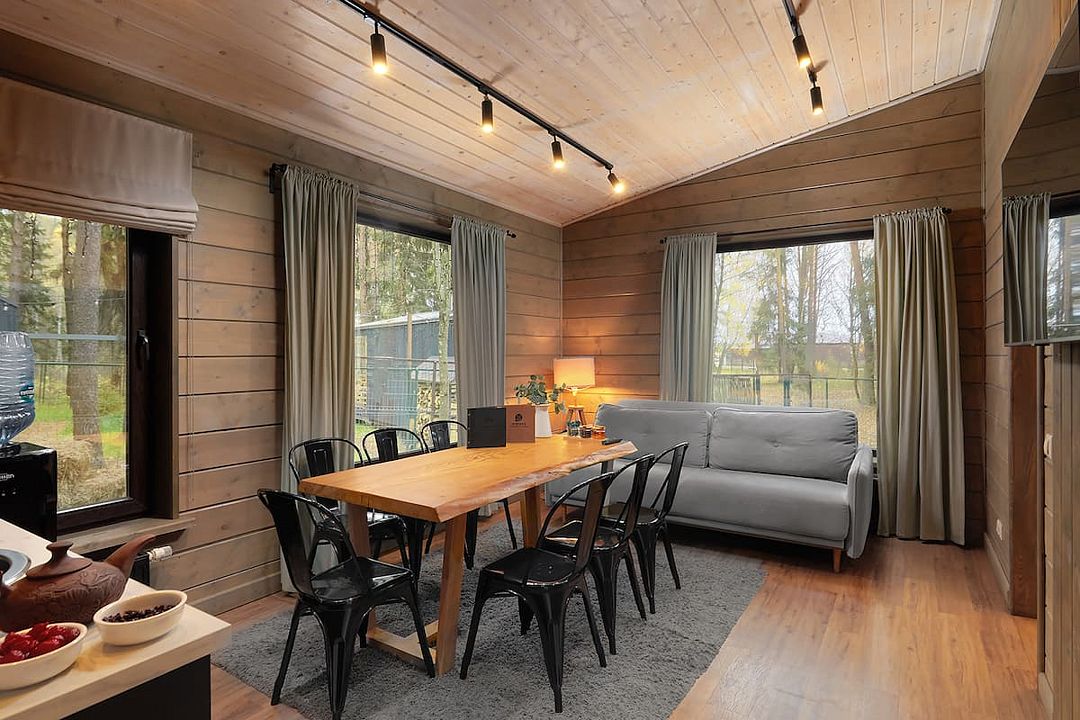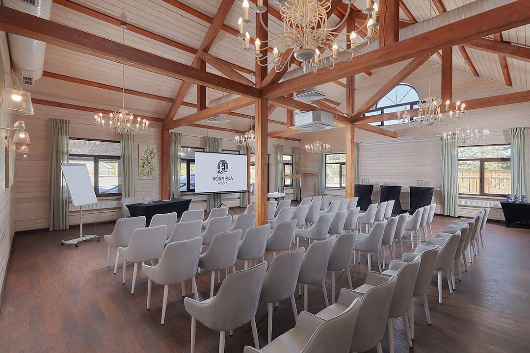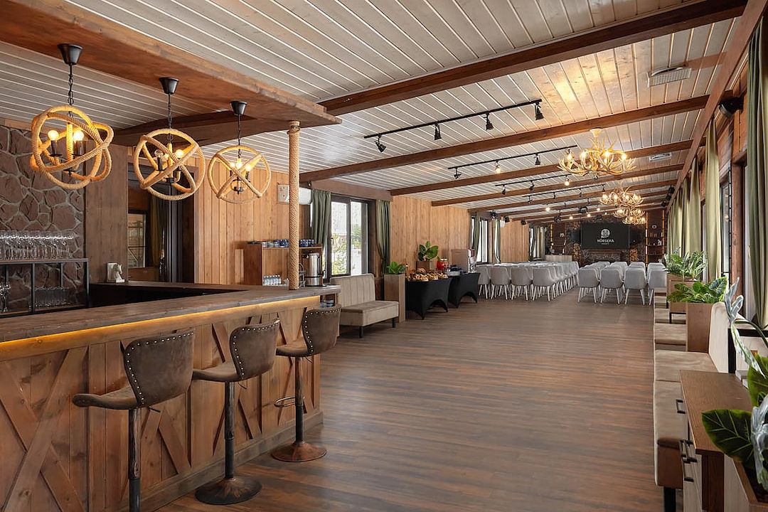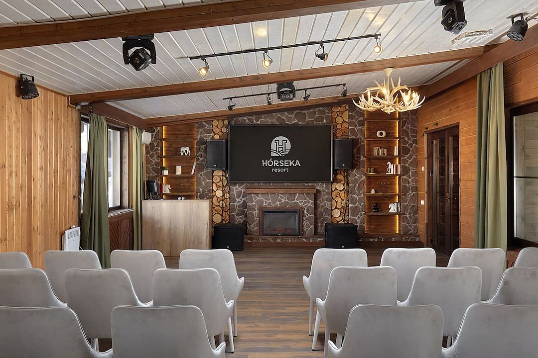 Зал рассчитан на девяносто гостей, что делает его отличным выбором для небольших и средних компаний. В зале есть бесплатный Wi-Fi, а из окон открывается прекрасный вид на лес, что добавляет очарования любому мероприятию.