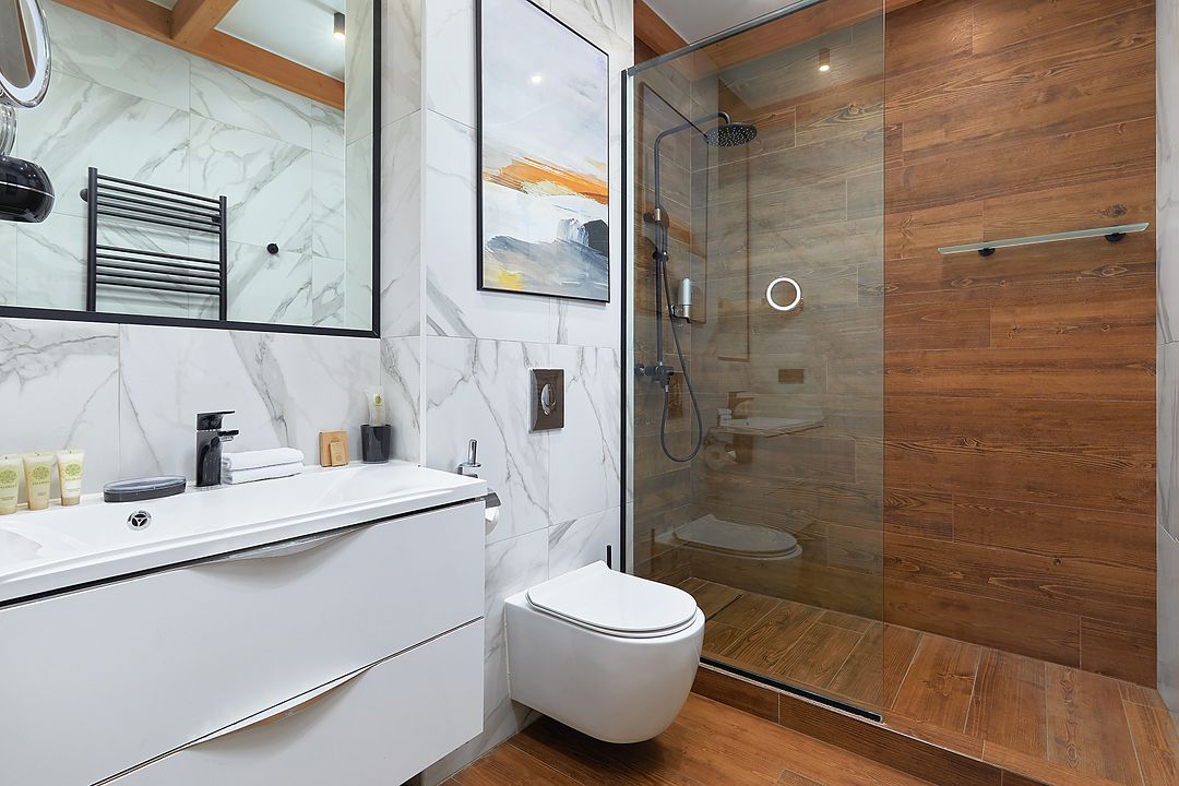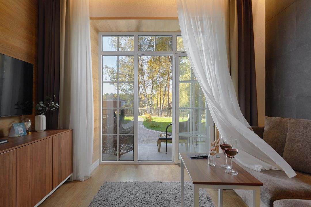 На нижнем уровне находятся прихожая, просторная гостиная, включающая обеденную зону, 2 дивана и настоящий электрический камин, ванная комната с ванной. Есть выход на большой балкон с прекрасным видом на лес. На верхнем уровне (подъем по лестнице) уютная спальня с двуспальной кроватью и панорамным окном, вид на лес.Услуги и удобства