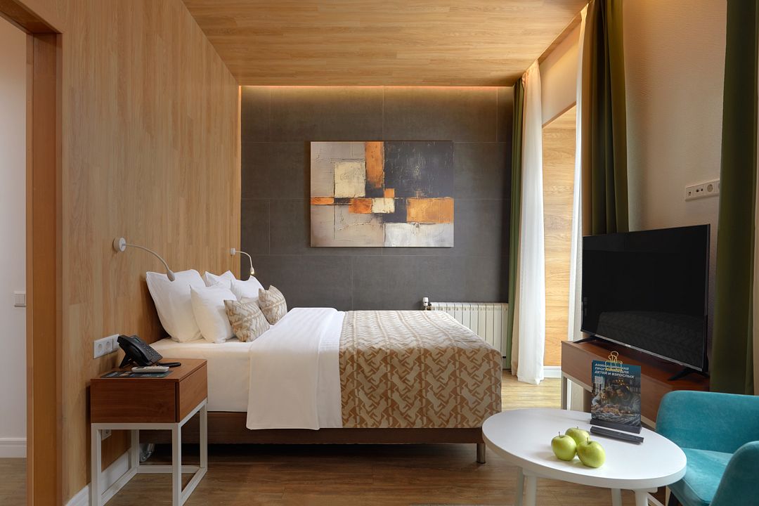 Просторный номер с высокими потолками. На выбор двухкомнатный номер или номер-студио, с ванной или душевой кабиной. В комнате одна большая кровать и зона отдыха.